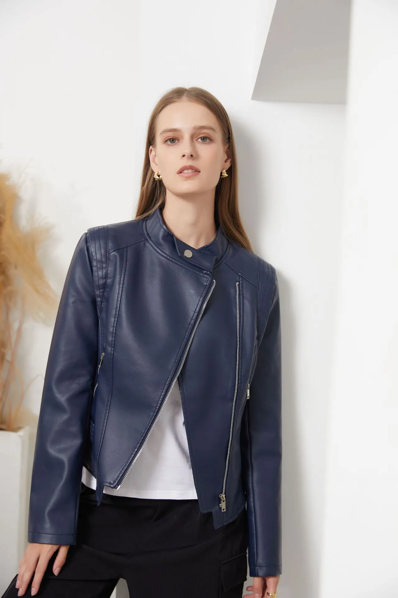PU Lapel Women Slim-fit Leather Coat Women