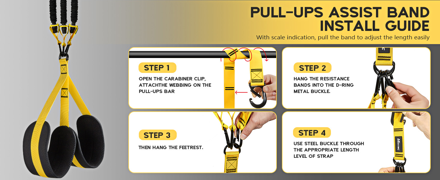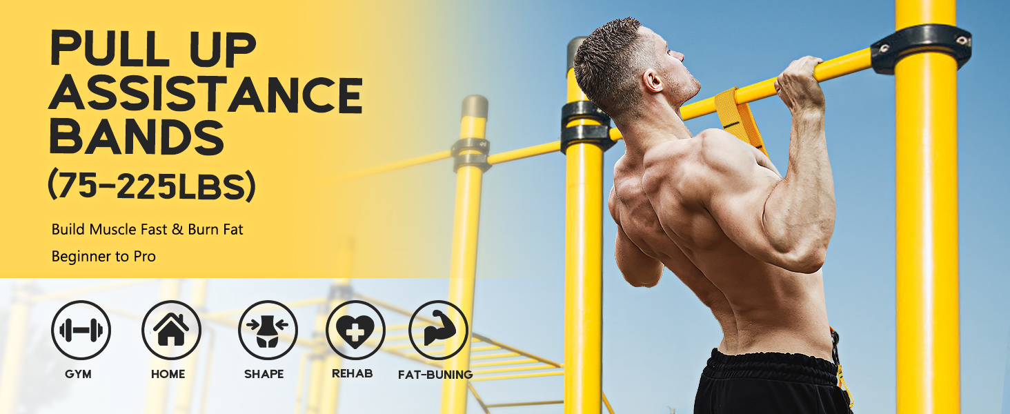 Heavy duty pull up assistance bands with height and resistance adjustable & comfortable double foot strap, It comes with 3 resistance bands, you can scale from 75lbs to 225lbs of assistance. Whether you're a beginner or advanced, Obese or thin people,these assisted pull up bands adapt to your strength level.