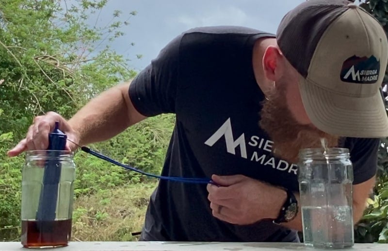 That's me sucking dirty water through the Pure Water Straw and spitting clean water into a jar... Absolutely crazy!