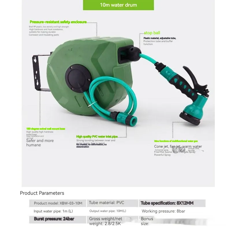 Qiya Automatic Retractable Hose Reel Water Drum Bobbin Winder Pneumatic Tools 10 M PVC Water Pipe Collector