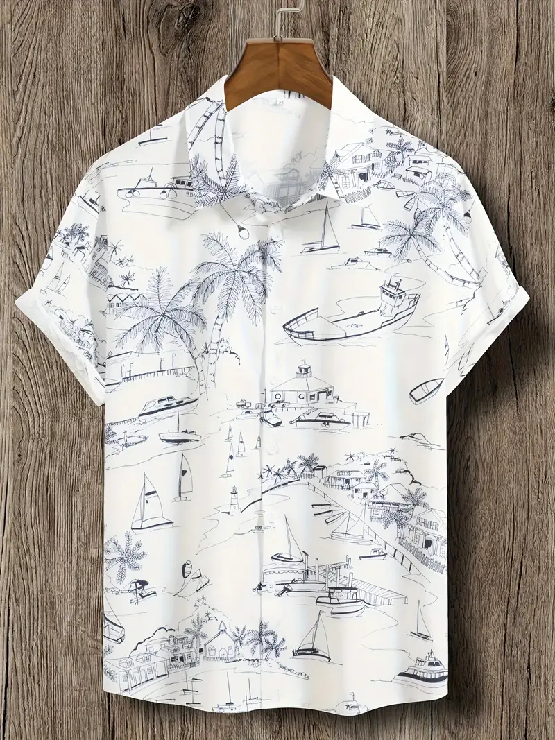 Quirky Anime Boat & Tree Print Mens Short Sleeve Button Down Shirt - Tropical Vacation Style - Breathable Summer Wear for Casual Chic