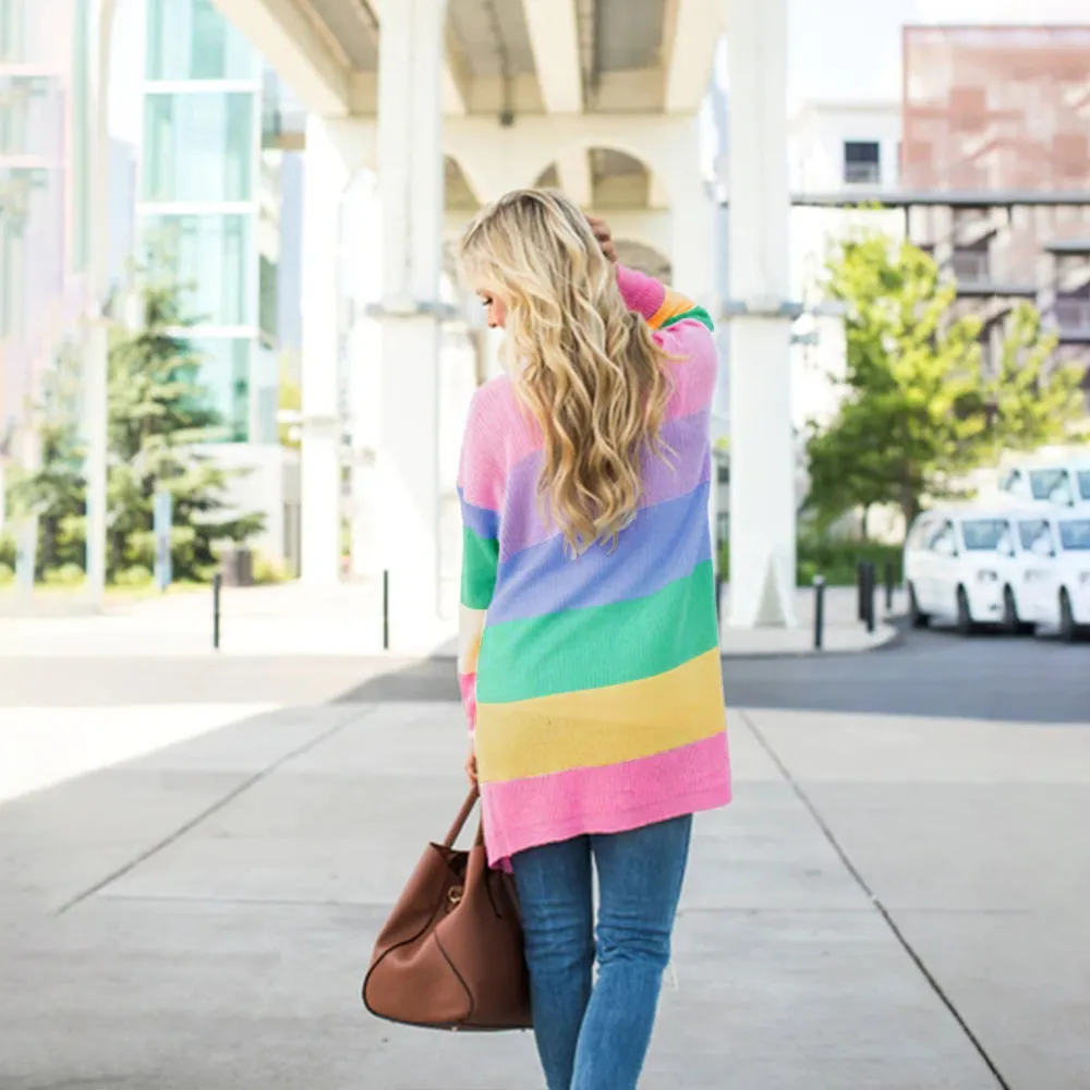 Bright Rainbow Stripes: Featuring a stunning array of rainbow colors, this cardigan is the perfect way to add a cheerful,