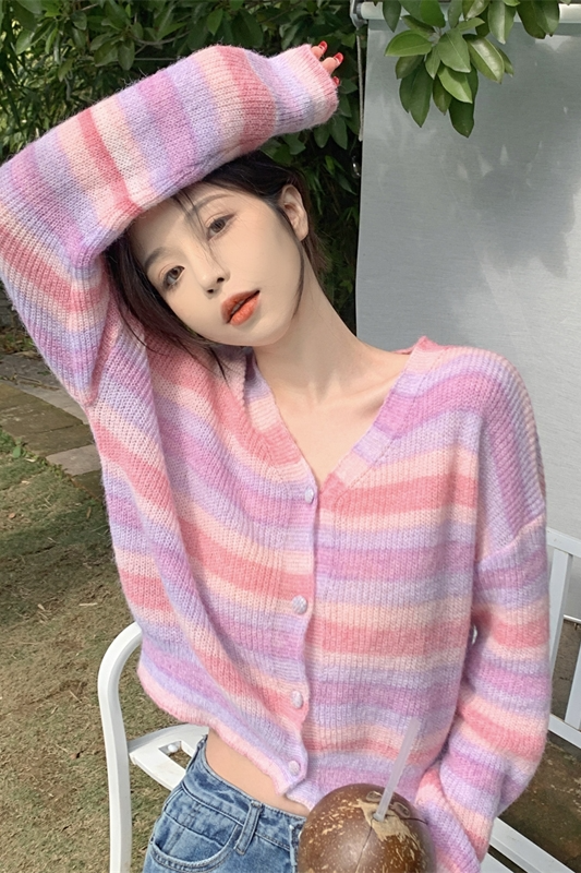 Rainbow Striped Knitted Cardigan Women's Spring Clothing