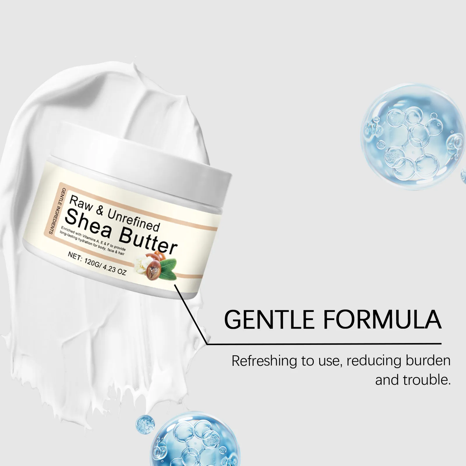 Raw & Unrefined Shea Butter enriched with Vitamins A, E, and F. Deeply hydrates and nourishes skin and hair. Ideal for daily use on the body, face, and hair for soft, smooth, healthy skin.