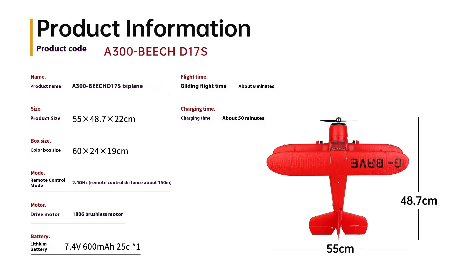 The Four-Way Brushless Glider is easy to control using its intuitive remote system, which allows users to navigate the glider through smooth turns, loops, and climbs. The glider’s rechargeable battery offers long flight times, and USB charging ensures quick recharges between sessions. Whether flying in wide-open fields or at the park, this brushless RC glider is built for speed, precision, and fun.