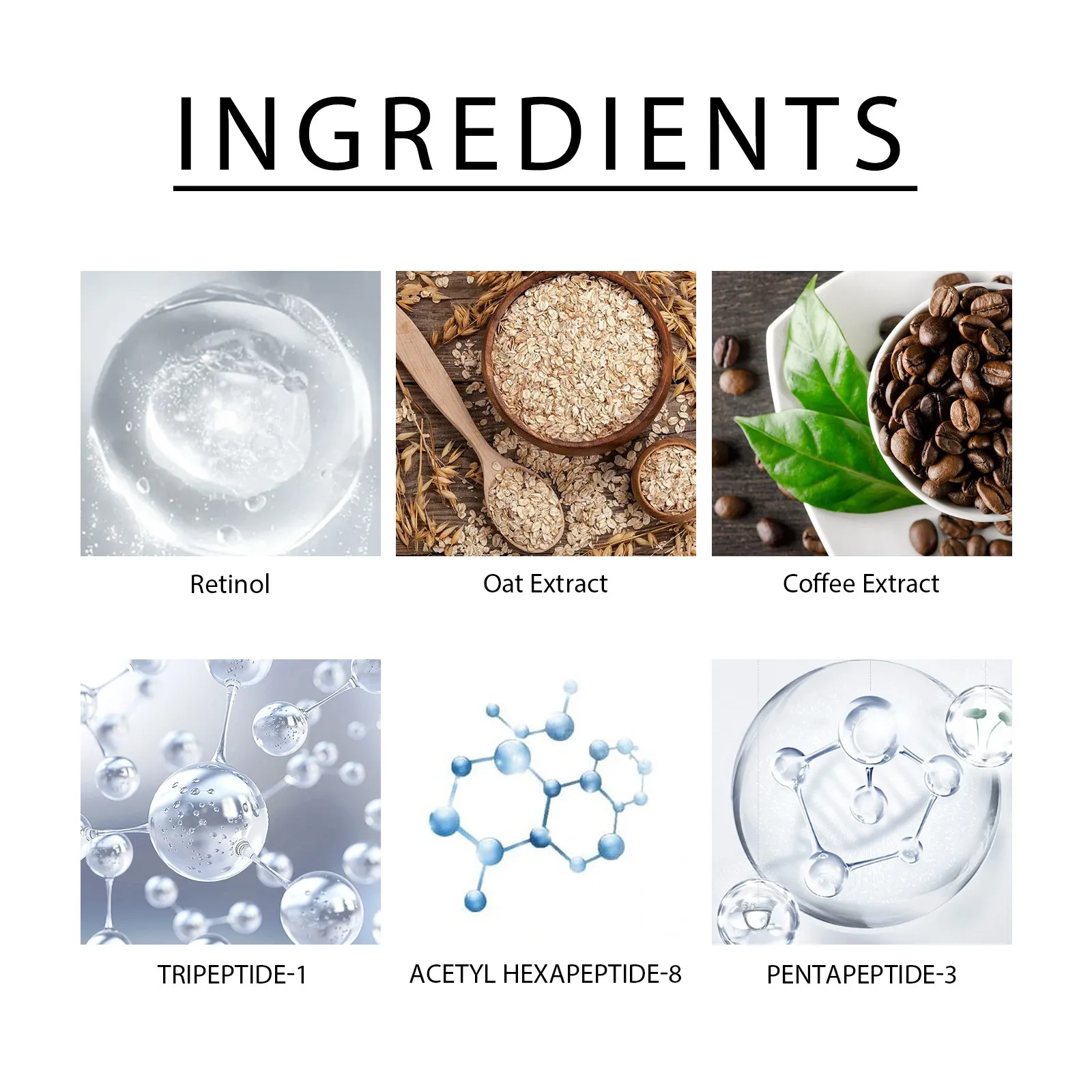 Ingredients: Retinol, oat extract, coffee extract, tripeptide-1, pentapeptide-3, acetyl hexapeptide-8