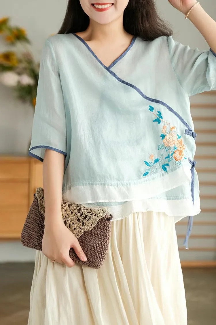 Crafted from high-quality, breathable fabric, this top ensures comfort throughout the day. The retro button details enhance the shirt's stylish appeal, while the embroidery provides a pop of color and texture, making it a standout piece in any wardrobe. Whether paired with jeans, skirts, or trousers, this shirt offers endless styling possibilities for any occasion.