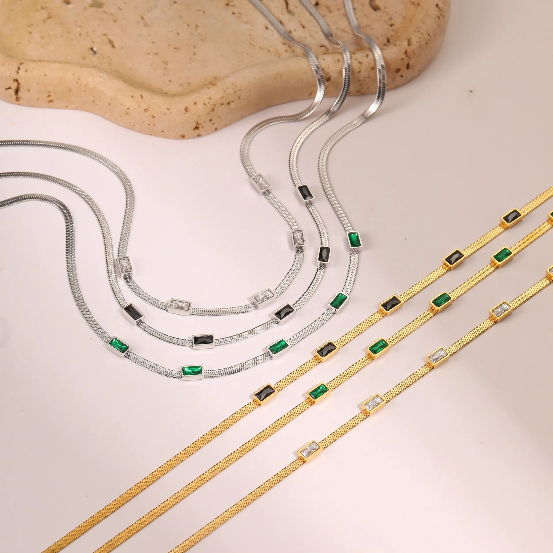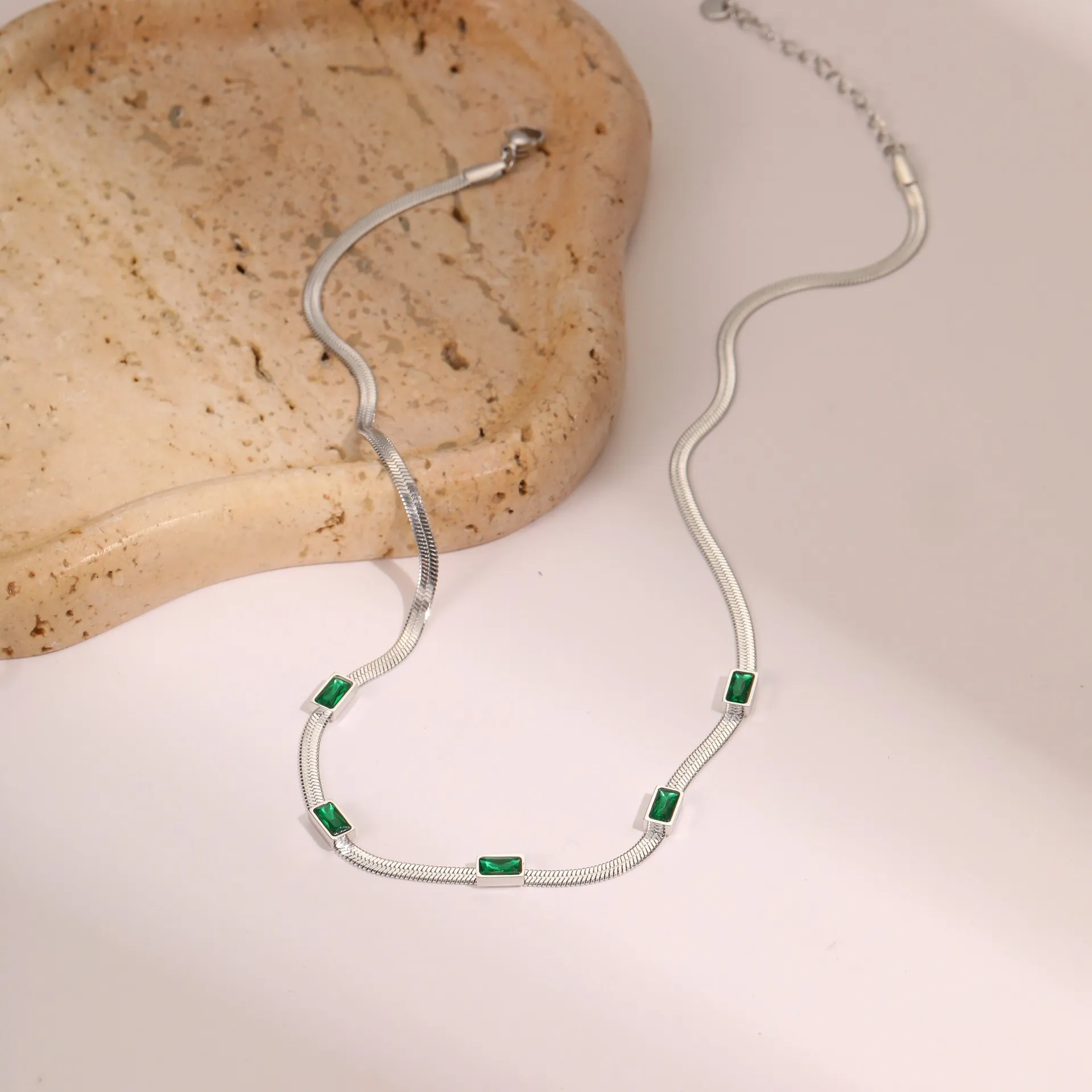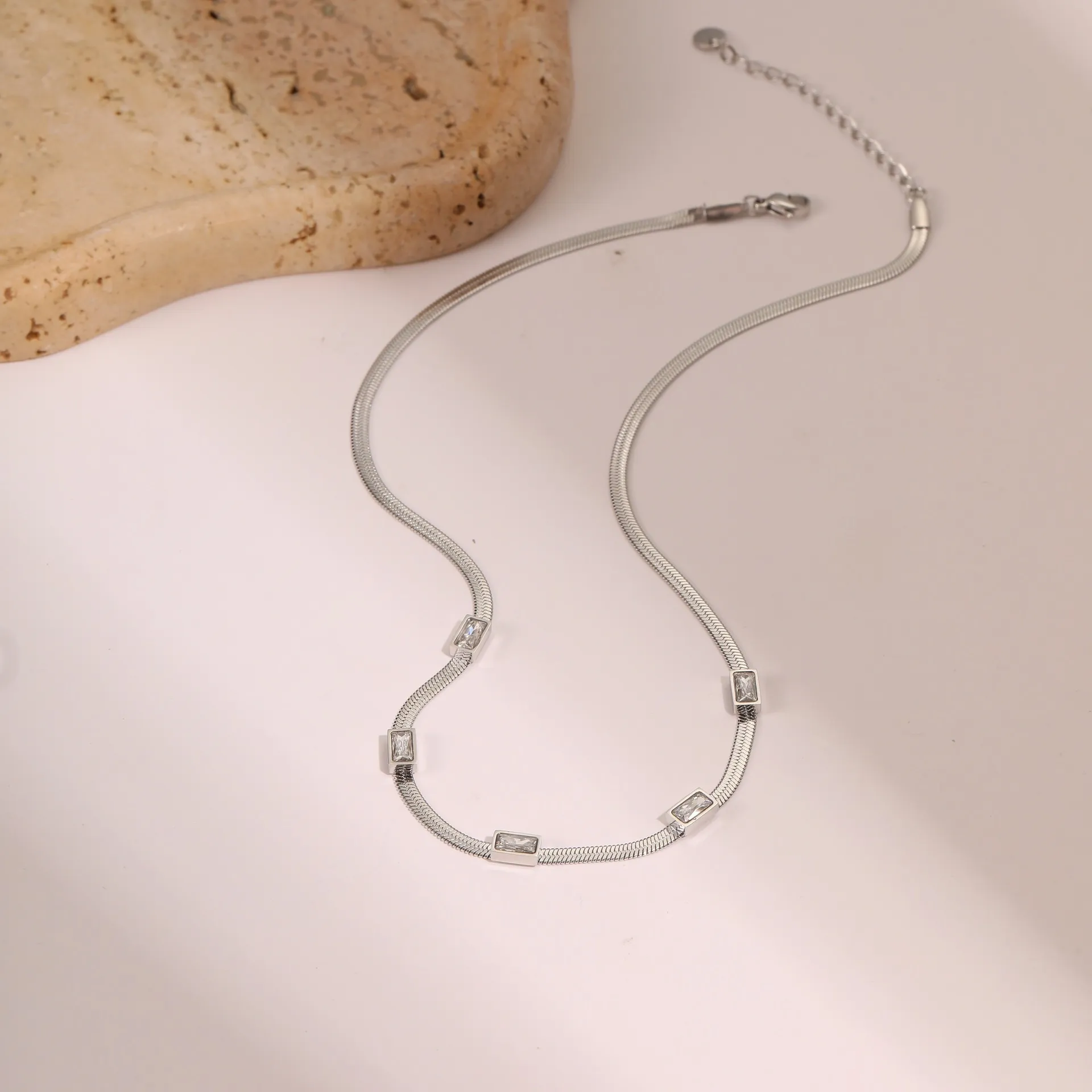 RETRO Geometric Square Zircon Necklace – Stainless Steel Flat Snake Chain