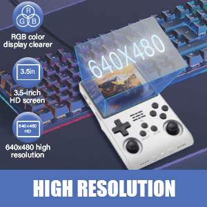 - Retro handheld game console : this emulator handheld 3.5 inch screen resolution reaches 640*480, CPU:AT12273S 32bit, support 32 bit games, built-in 32G card 10000+ classic games, support large screen output. Support connecting the handle, two-player game