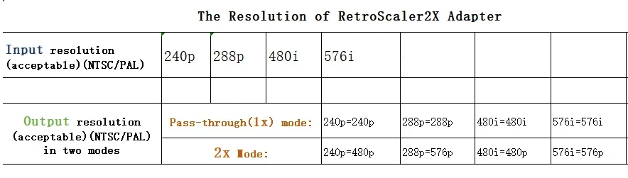 The RetroScaler2x can accept 240p/480i/288p/576i NTSC/PAL sources to converter to 480p/576p HDMI output (480p for NTSC, 576p for PAL). For example 240p signals are supported properly, allowing for a completely progressive linedouble to 480p. 480i signals are deinterlaced and doubled also to 480p. Keep in mind that the output resolution of this device only up to 480p/576p.