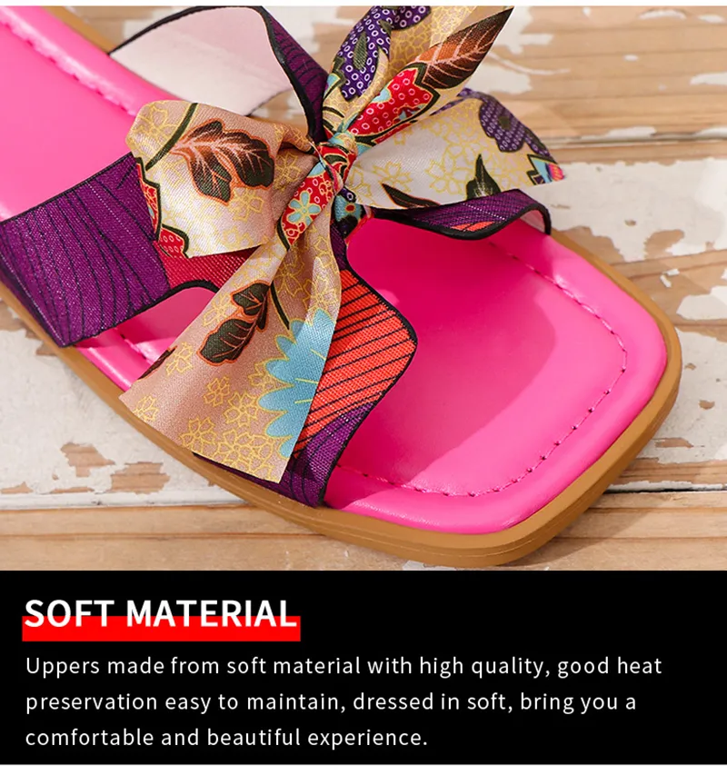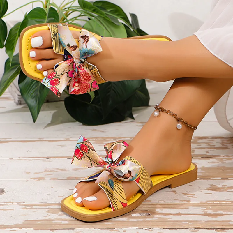 Ribbon Bow Sandals: Summer Square Toe Low-Heel Slides for Women