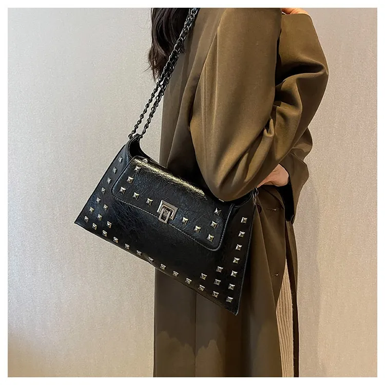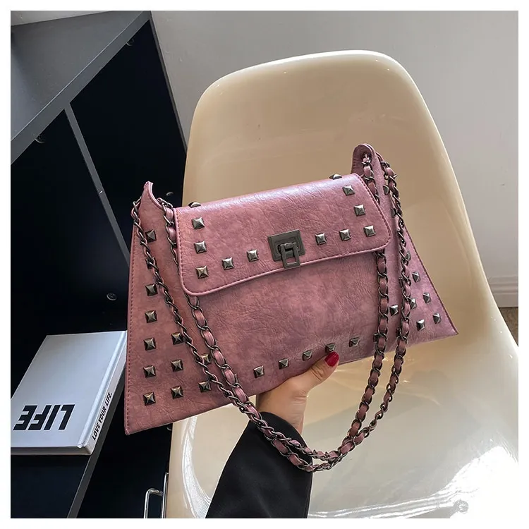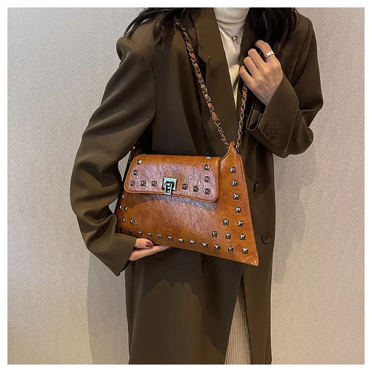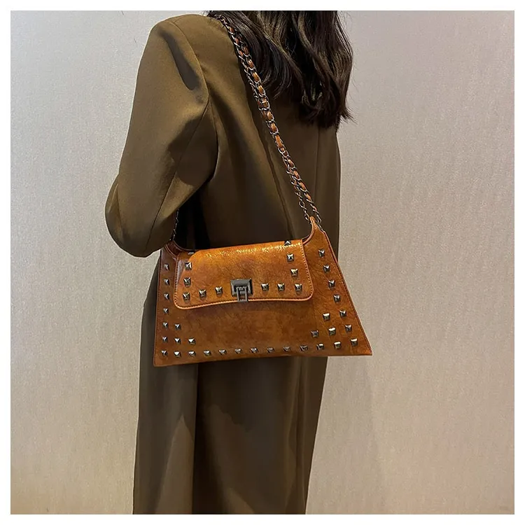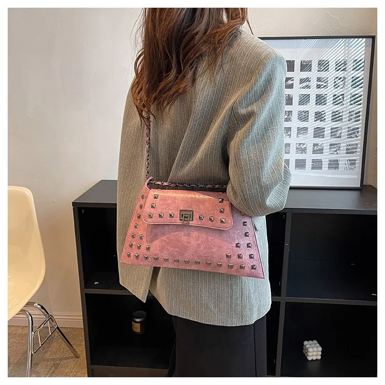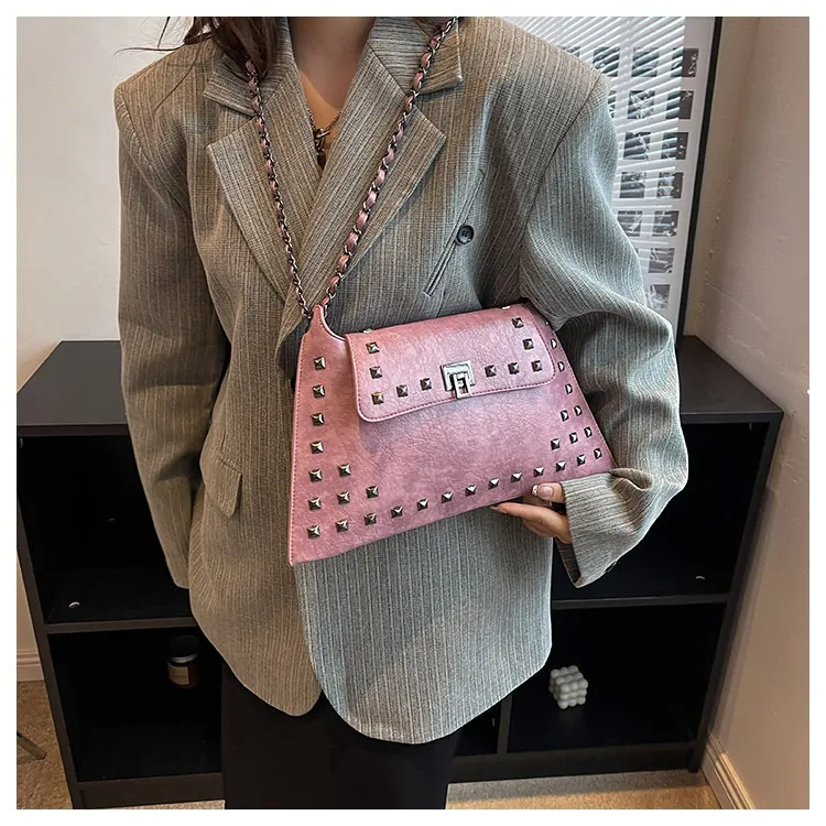 This bag features a modern rivet-adorned design that complements any outfit, making it perfect for various occasions.
