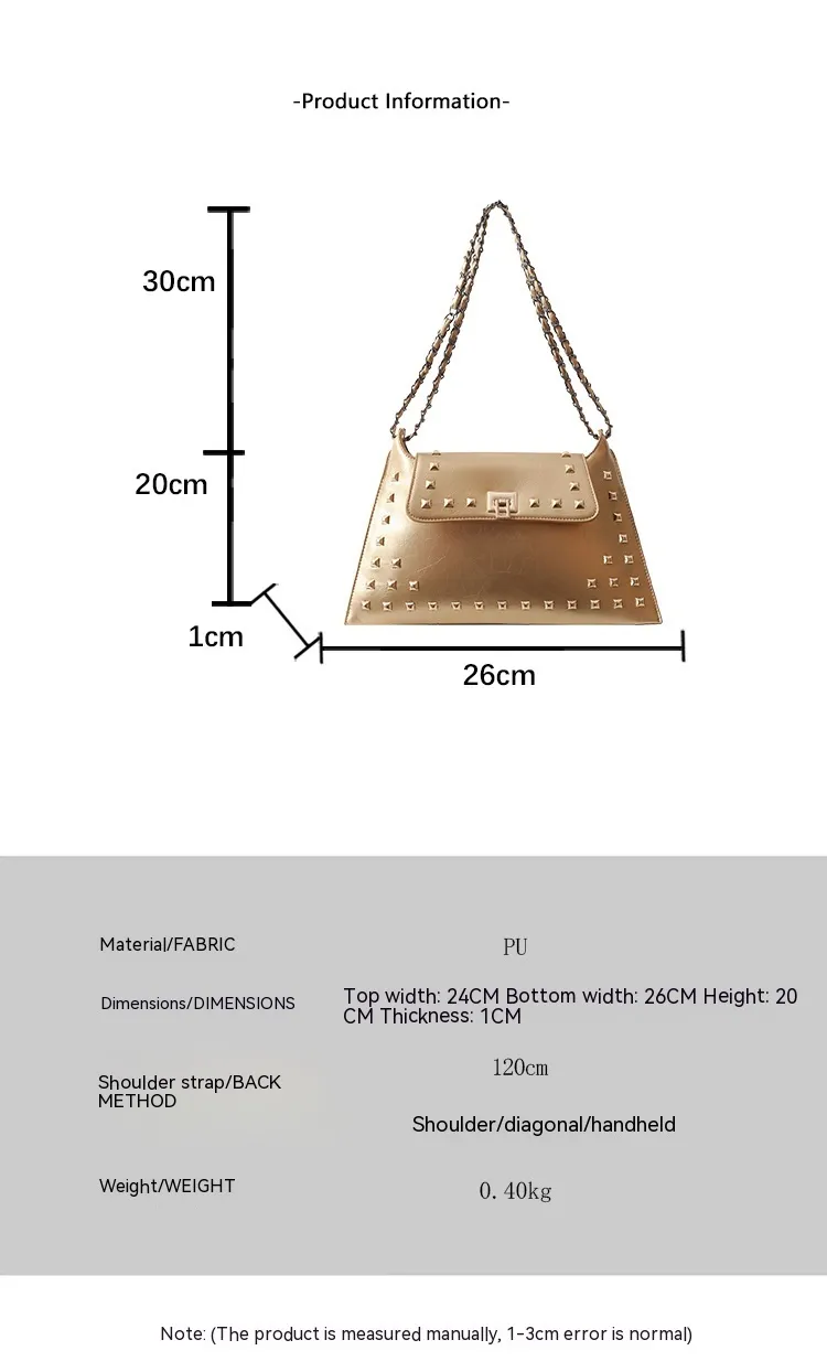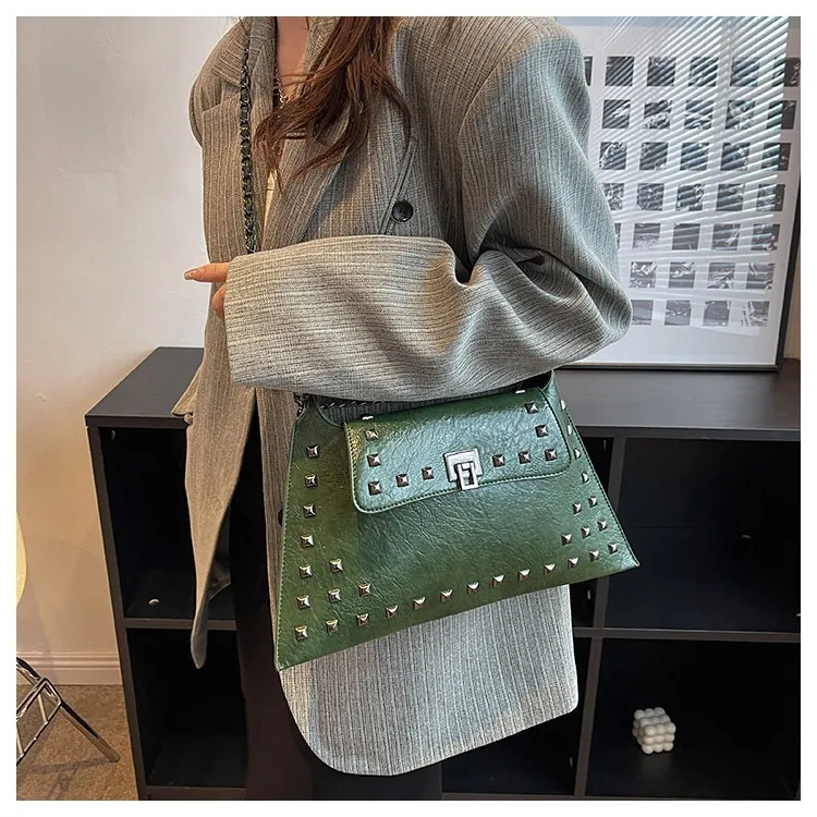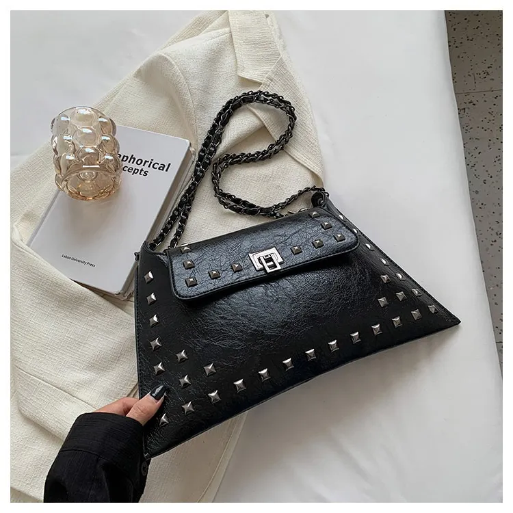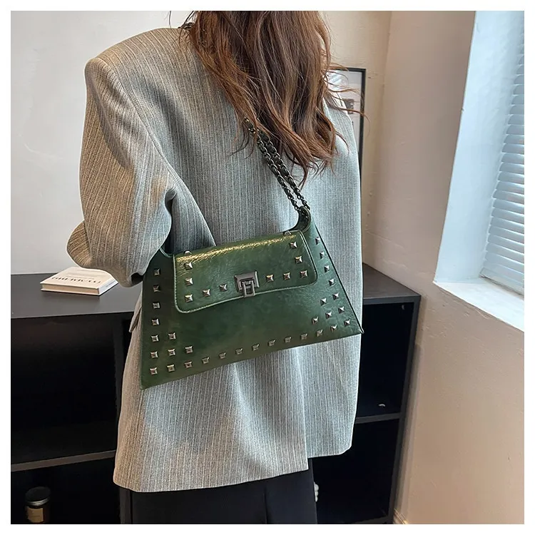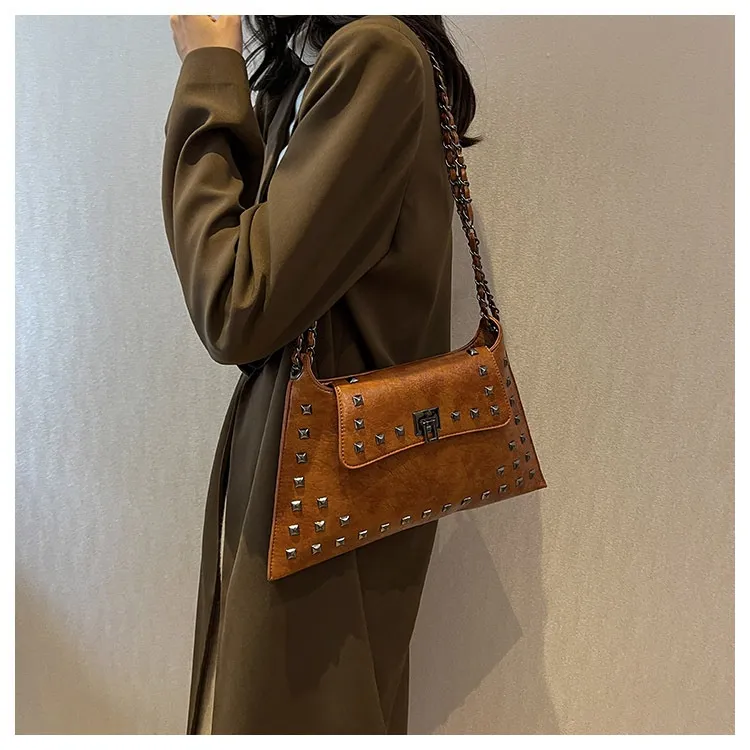 This bag features a modern rivet-adorned design that complements any outfit, making it perfect for various occasions.