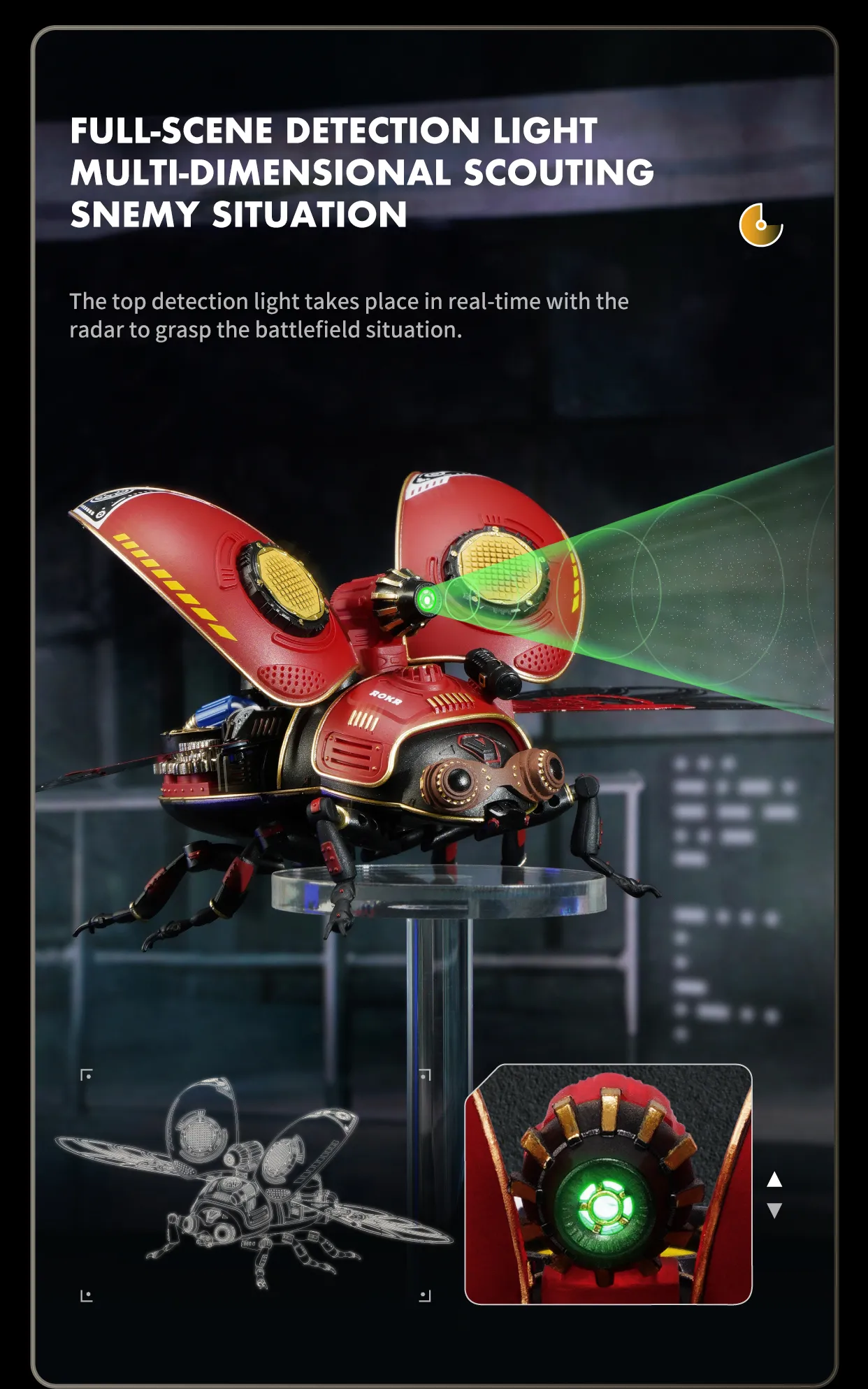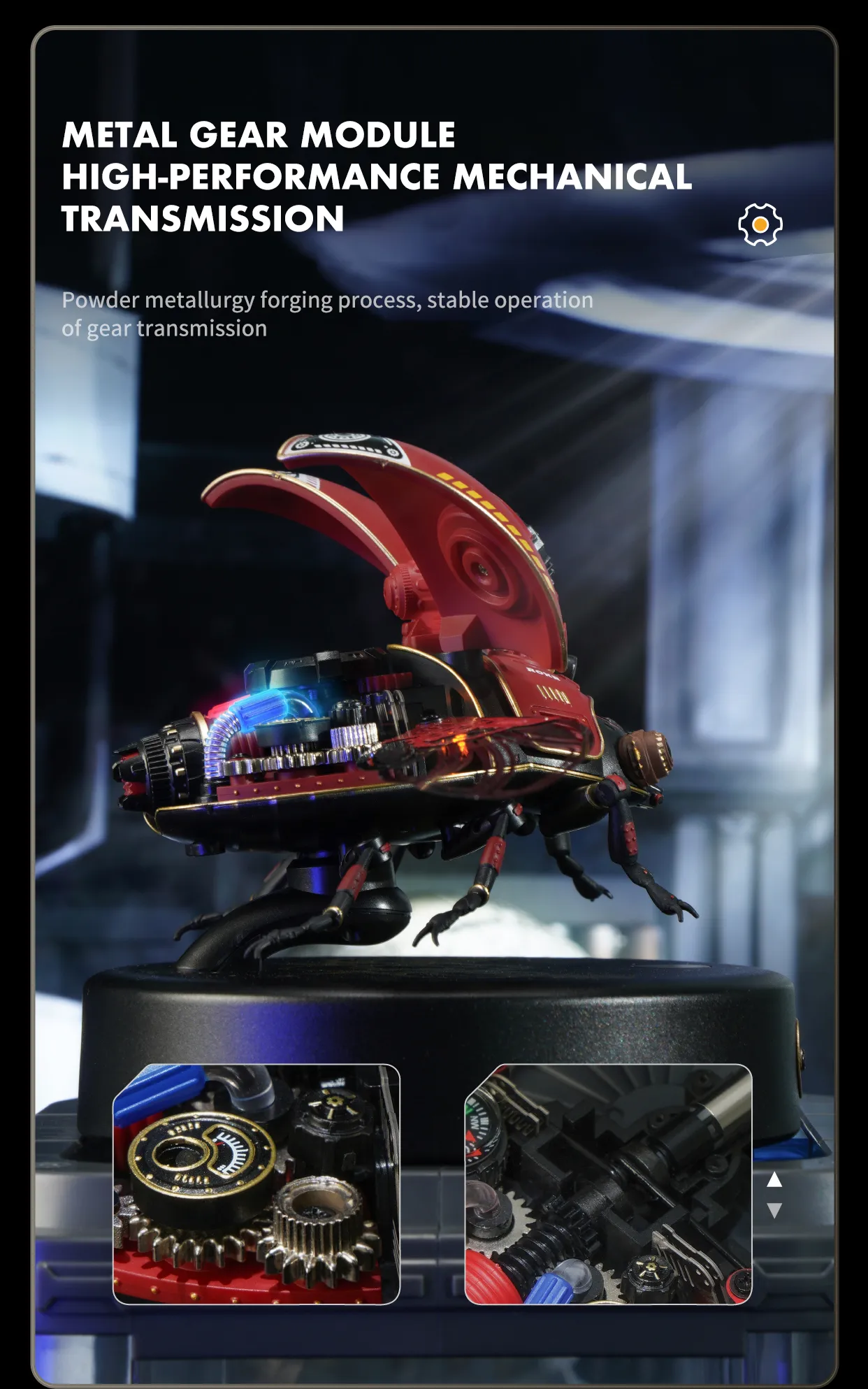 3.Beetle body has a complex internal gear structure and micro-planetary wheel structure engine, can make the gear drive stable operation. In addition, the body is also equipped with LED light source module, convenient to play at night.