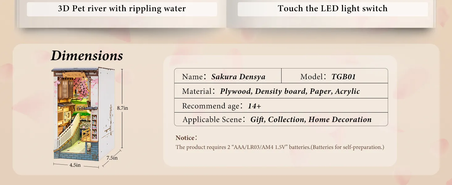 Start by following the included instructions, assembling each pre-cut piece and adding decorative elements as you go. Attach the LED light feature for a warm glow, enhancing the scene’s details. Once complete, place the book nook on your bookshelf, between your favorite books, or use it as a standalone piece to add character to a reading corner or display.