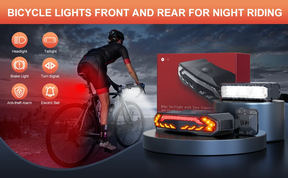 â— [BIKE HEADLIGHT-TAILLIGHT COMBINATIONS]: Get your bike with both the front and back light at the same time. The main front light and rear red light have multiple settings to adjust the brightness and flashing sequence. Ultra bright light that lights up a wide area to get the attention of those car drivers and useful for any evening commuting. [In addition, the taillights come with turn signals and bicycle alarms feature, through the wireless remote control].