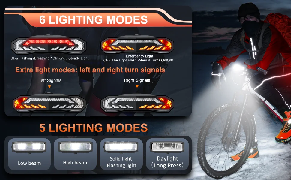 â— [MORE IN ONE SMART BIKE TAIL LIGHT WITH TURN SIGNALS]: Multi-function anti-theft bike alarm tail lights. Feature with brake light /turn signal/warning light/electric bell/anti-theft alarm. 31 COB LEDs to bring the brightness of the bicycle taillight to reach 160 lumens, 200-degree wide-angle design makes you more visible during the night ride. With 6 lighting modes, Slow Flashing / Breathing / Fast Blinking/ Steady Light / Emergency Light / OFF.