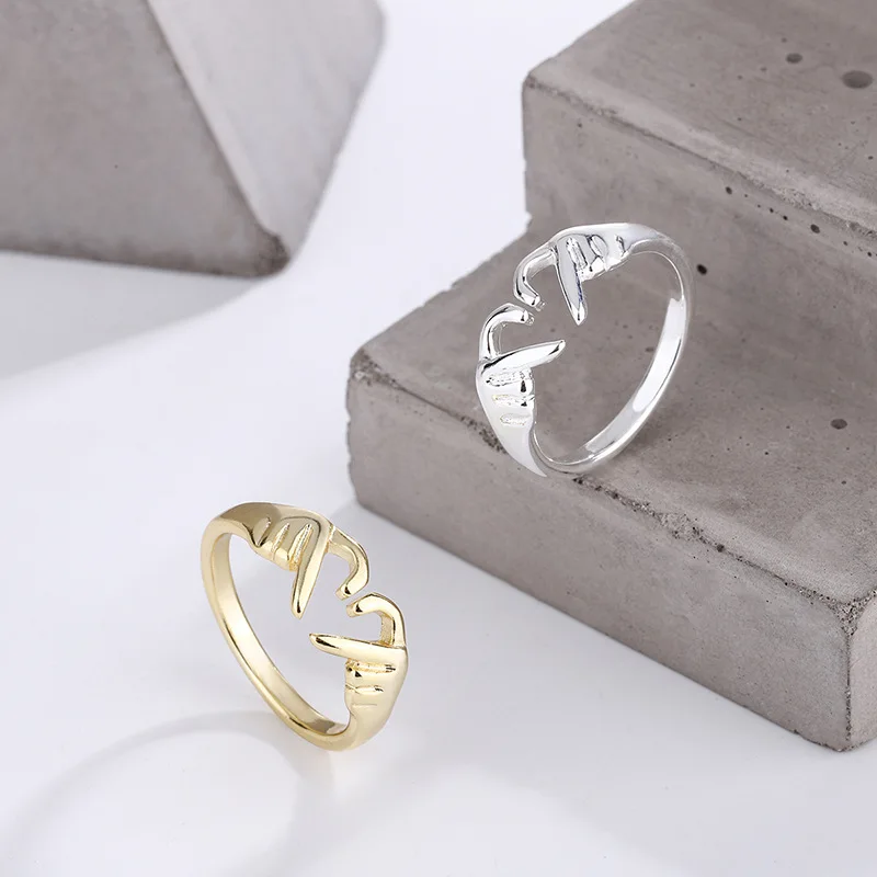 Romantic Heart & Hand Couple Ring Silver Adjustable Open Ring for Lovers