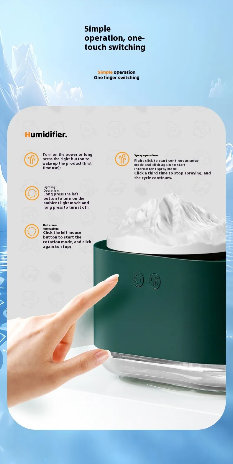 The unique rotating iceberg design not only looks sleek and modern but also enhances the humidification process by distributing mist more evenly across the room. The rotating effect adds a touch of visual beauty, making it a striking decoration for your space.