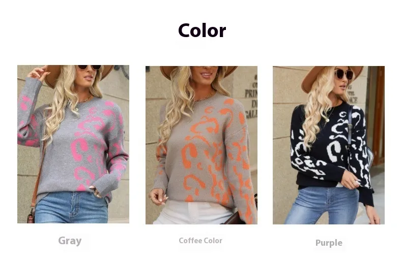 Add bold style to your wardrobe with the Round Neck Pullover Leopard Print Long Sleeve Mid-Length Sweater. Featuring a chic leopard print, long sleeves, and a comfortable mid-length design, this sweater is perfect for casual and semi-casual wear.