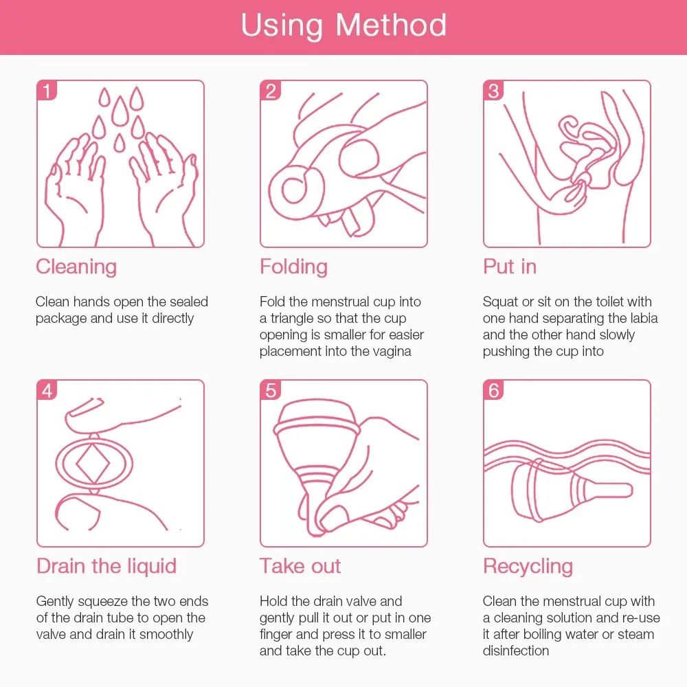 Cleaning: After each use, rinse the cup with warm water and mild, unscented soap. Once your period is over, sterilize the
