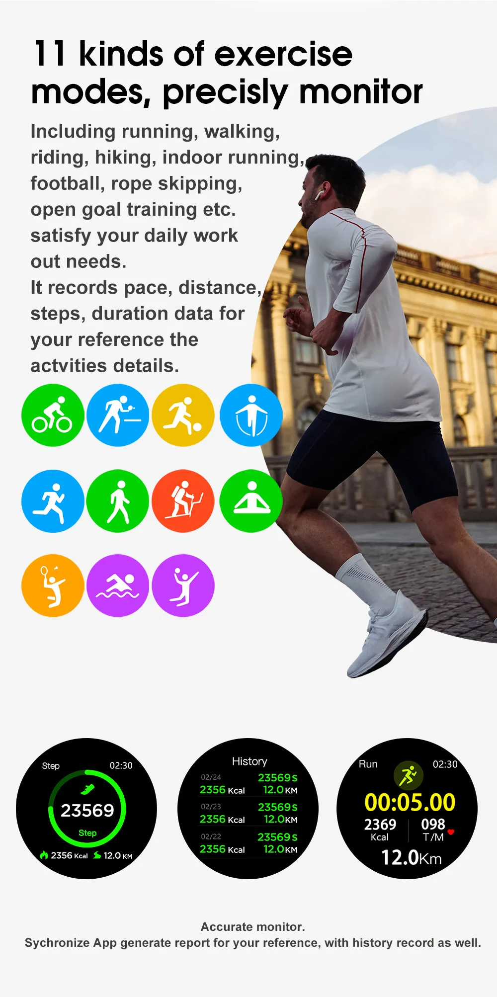 - Fitness Tracking: Monitors steps, calories burned, distance, and multiple sports modes