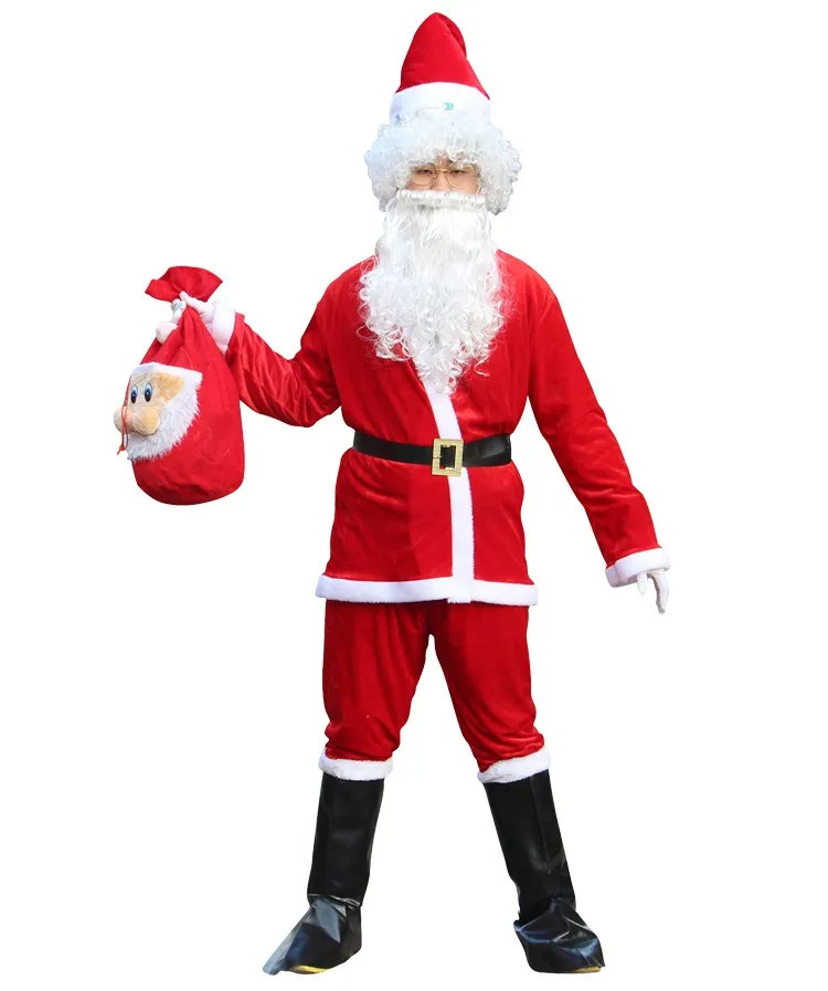 A full Santa outfit includes all the necessary accessories to complete the look. This typically includes a Santa hat with a white pom-pom, a white faux beard and wig (if you're not naturally sporting a snowy beard), a black belt with a gold or silver buckle, and knee-high black boots. Some sets may also include gloves, glasses, or even a sack for delivering gifts, adding to the festive charm and authenticity of the look.