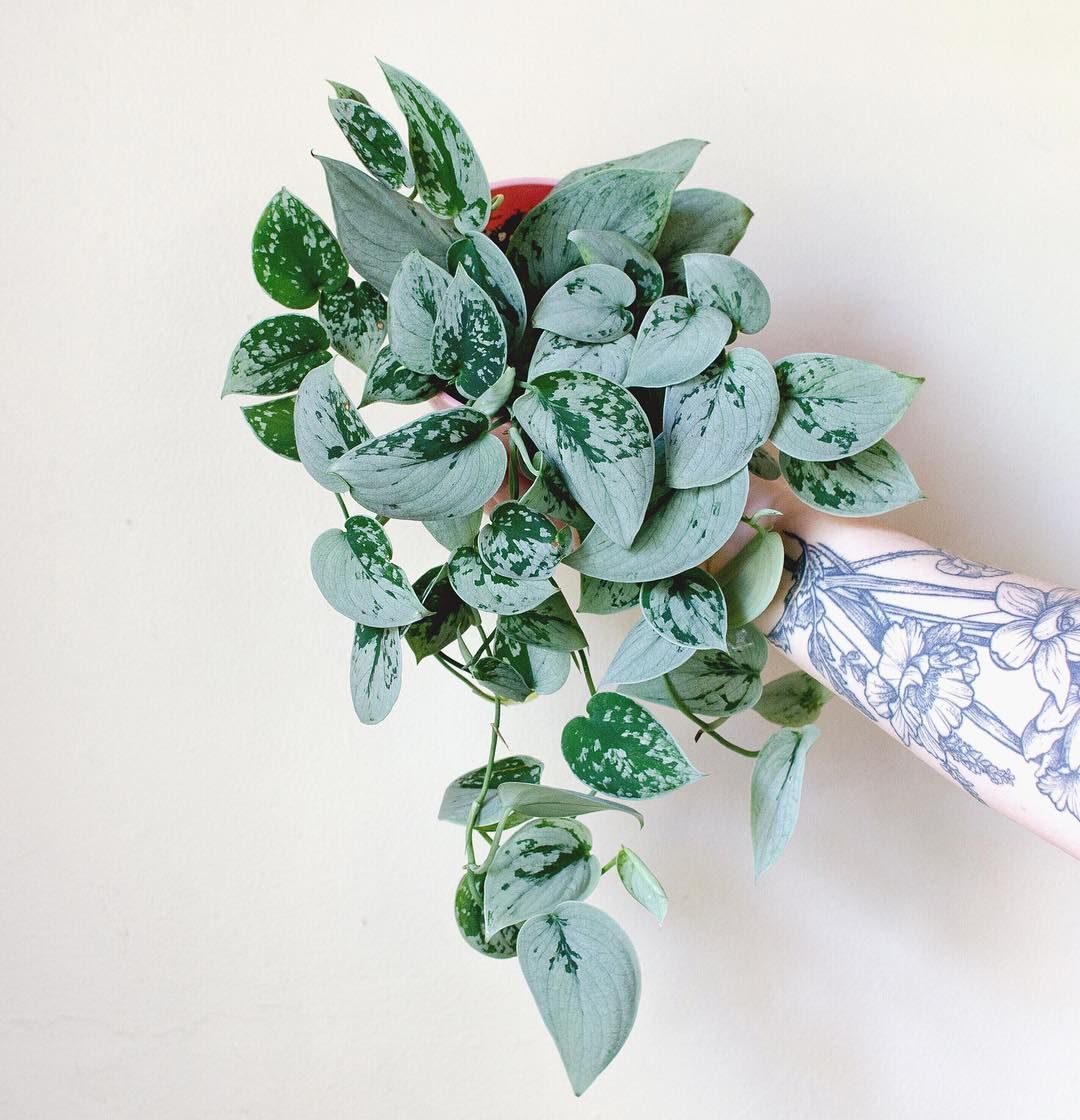 Scindapsus pictus 'Silvery Ann' is a satin pothos cultivar with a high level of silvery variegation. Leaves are succulent and heart shaped with a satin finish that makes them delightfully soft to the touch. This plant makes a beautiful hanging basket but will also climb a support if given one.