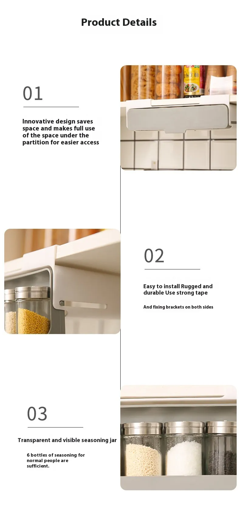 Choosing the Seasoning Bottle Kitchen Hanging Storage Rack means opting for a practical, efficient, and space-saving solution for organizing your kitchen. Its punch-free design allows for easy installation, and its durable construction ensures long-term use. The adjustable compartments make it versatile enough to store a variety of bottles, while the sleek design ensures that it complements your kitchen’s aesthetics.