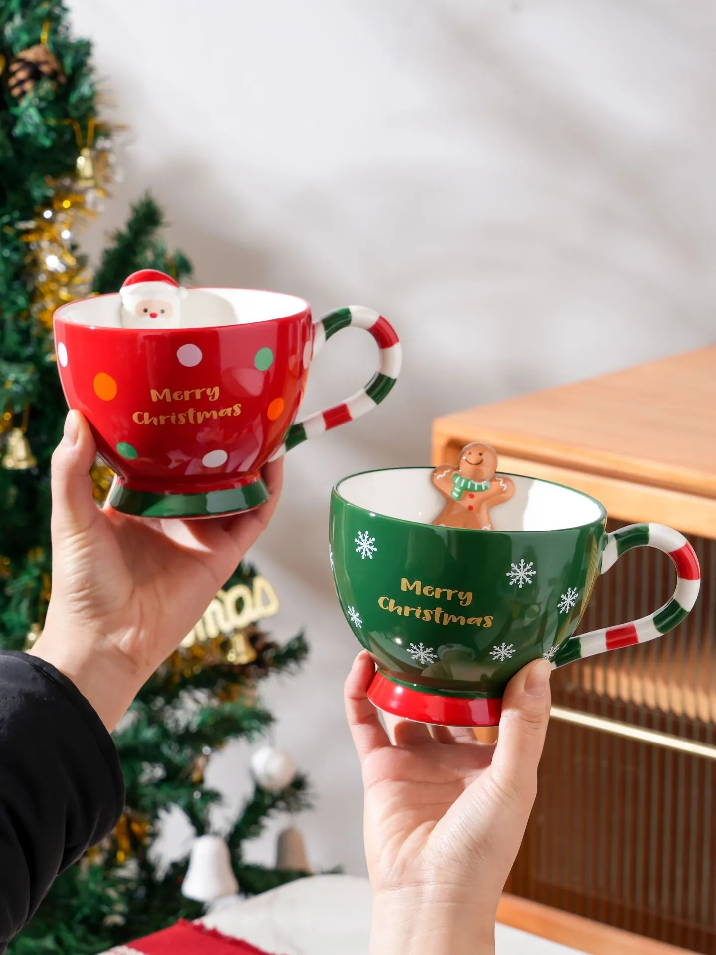 Color: green gingerbread man, red Santa Claus