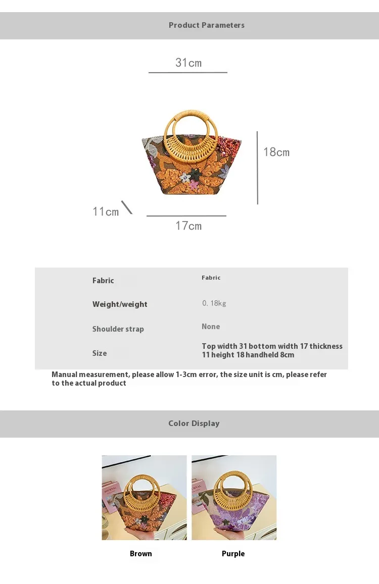 The Sequin Straw High-Grade Sense Niche Embroidered Bag is a statement accessory that blends artistry, craftsmanship, and fashion into a functional, stylish piece. Perfect for women who love a unique touch to their accessories, this bag brings together shimmering sequins, natural straw elements, and delicate embroidery, creating a sophisticated and eye-catching design. Ideal for both formal and casual occasions, this bag adds a touch of elegance and modernity to any outfit, whether you're attending a special event, a day at the beach, or a casual brunch.