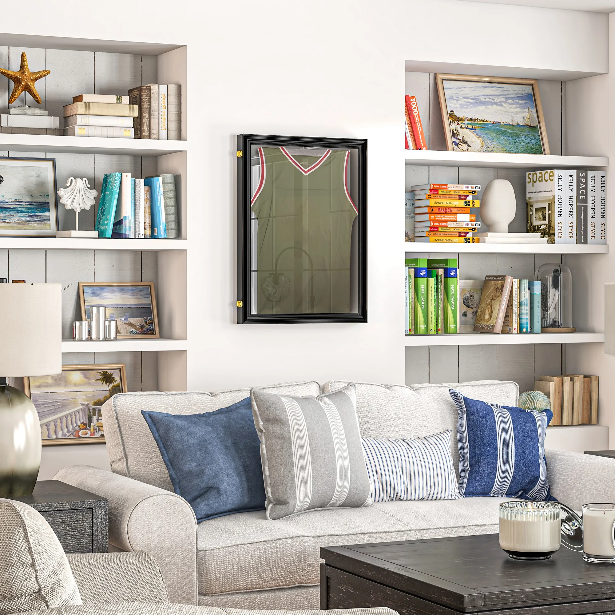 - - Hanger inside and hooks on the back for displaying your sports memorabilia