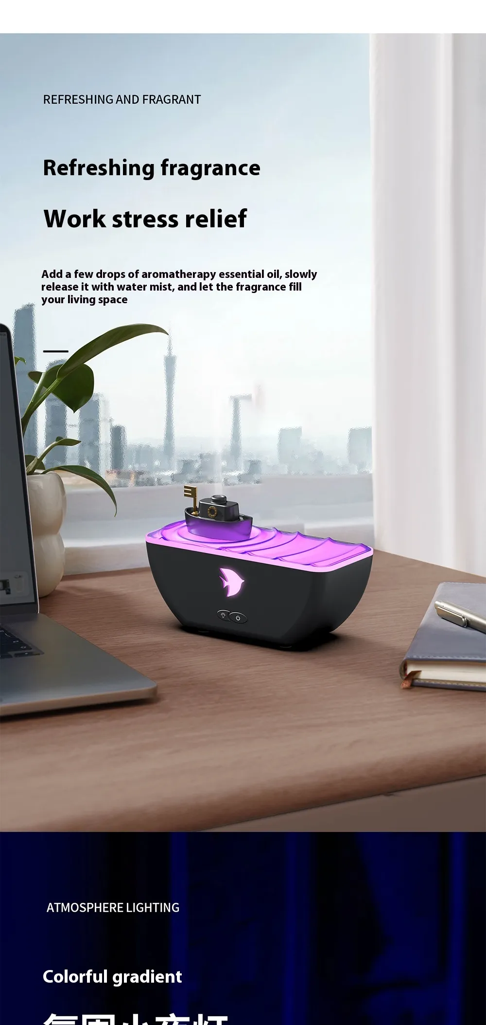 The aroma diffuser fills your space with soothing scents, while the soft gradient lighting creates a tranquil atmosphere perfect for unwinding after a long day.