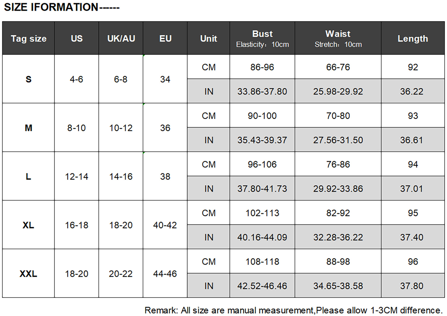 allow 2-3cm differences due to manual measurement.