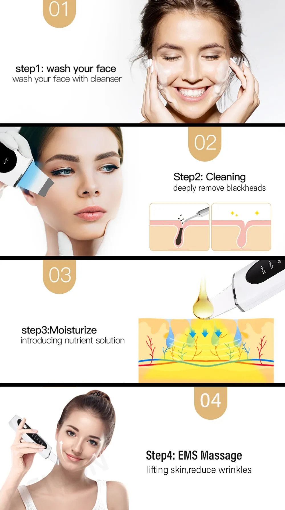 - Improved Skin Texture: Regular use of the ultrasonic feature helps improve skin texture by removing dead skin cells, promoting smoother, more even skin. It also enhances the absorption of skincare products, allowing them to work more effectively.