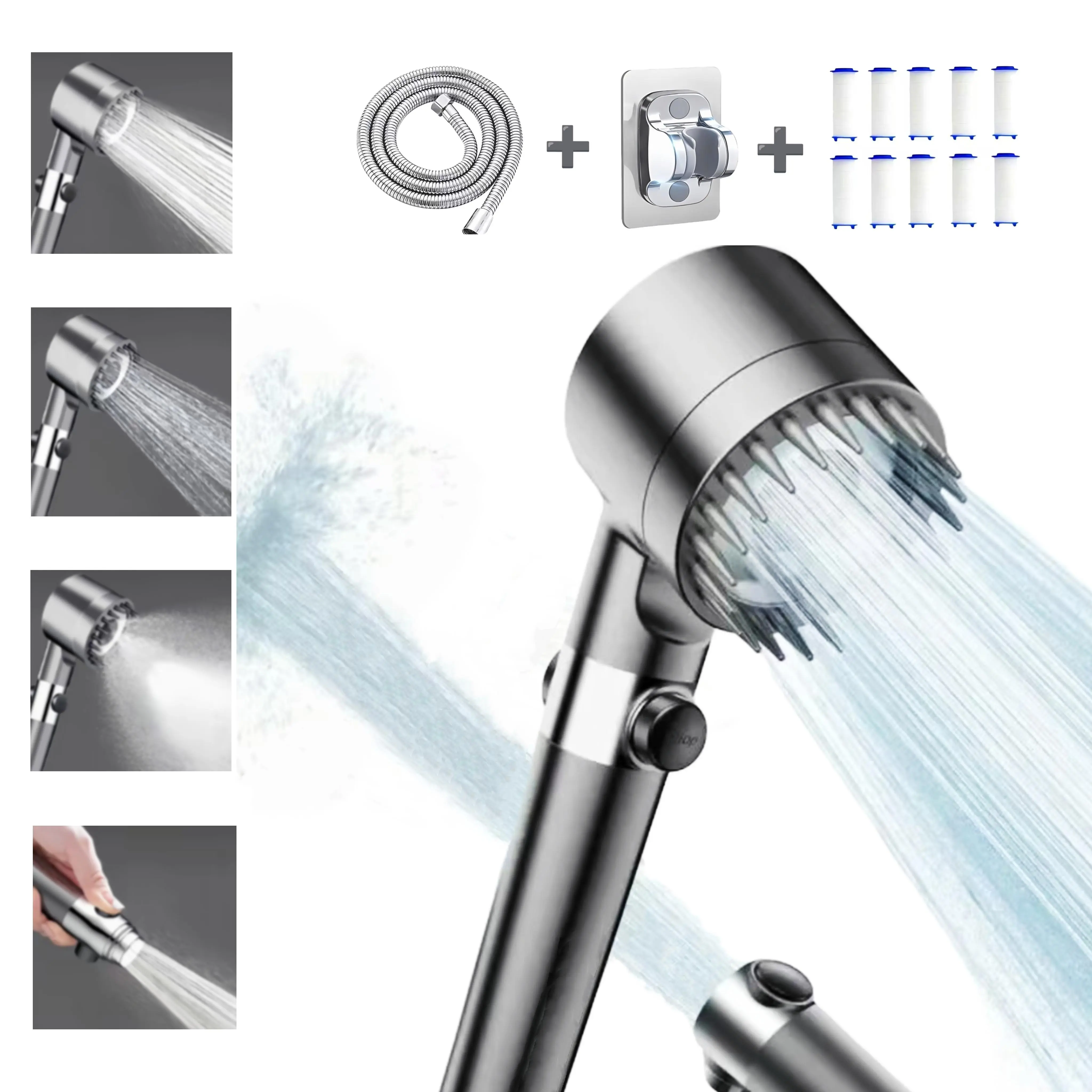 Simple and convenient installation; The shower head is equipped with everything needed for quick and easy installation, including a multifunctional handheld shower, a 59 inch hose, 5 cotton filters, and an adjustable bracket. Without professional assistance, you can enjoy high-pressure water, water-saving functions, and scalp massage shower experience.