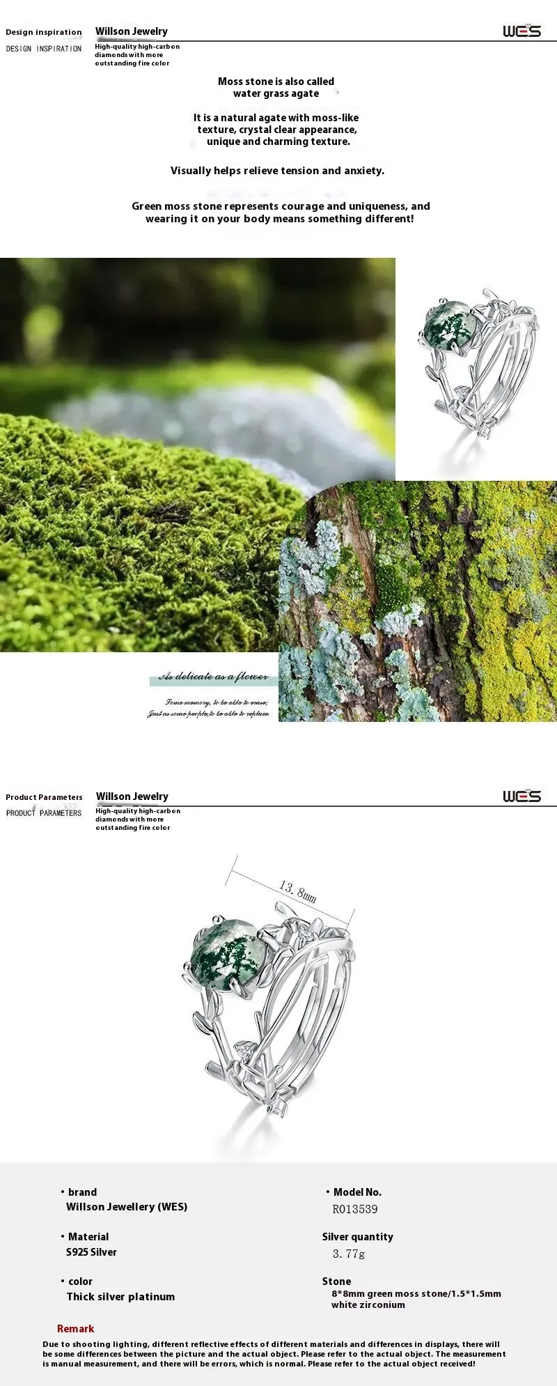 The green moss stone, set against the sleek silver band, creates a striking contrast that draws attention while maintaining a subtle sophistication. Each stone has its own unique pattern, reflecting the intricate details of moss-covered landscapes, making every ring one-of-a-kind. The timeless design ensures this ring can be worn alone for a minimalist look or paired with other jewelry for a layered, stylish statement. Lightweight and comfortable, it's suitable for daily wear or as a special piece for evening occasions.