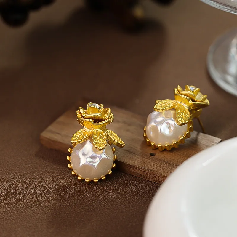 Silver Stud Rhinestone-encrusted Flower Irregular Pearl Earrings Elegant