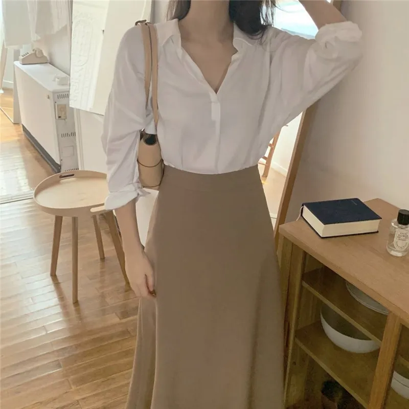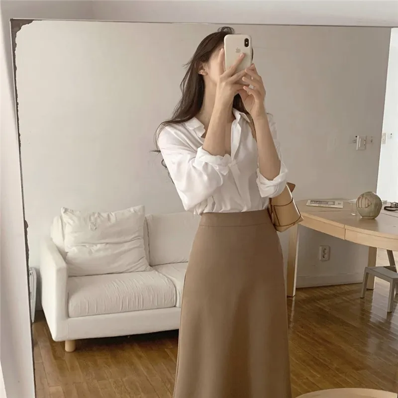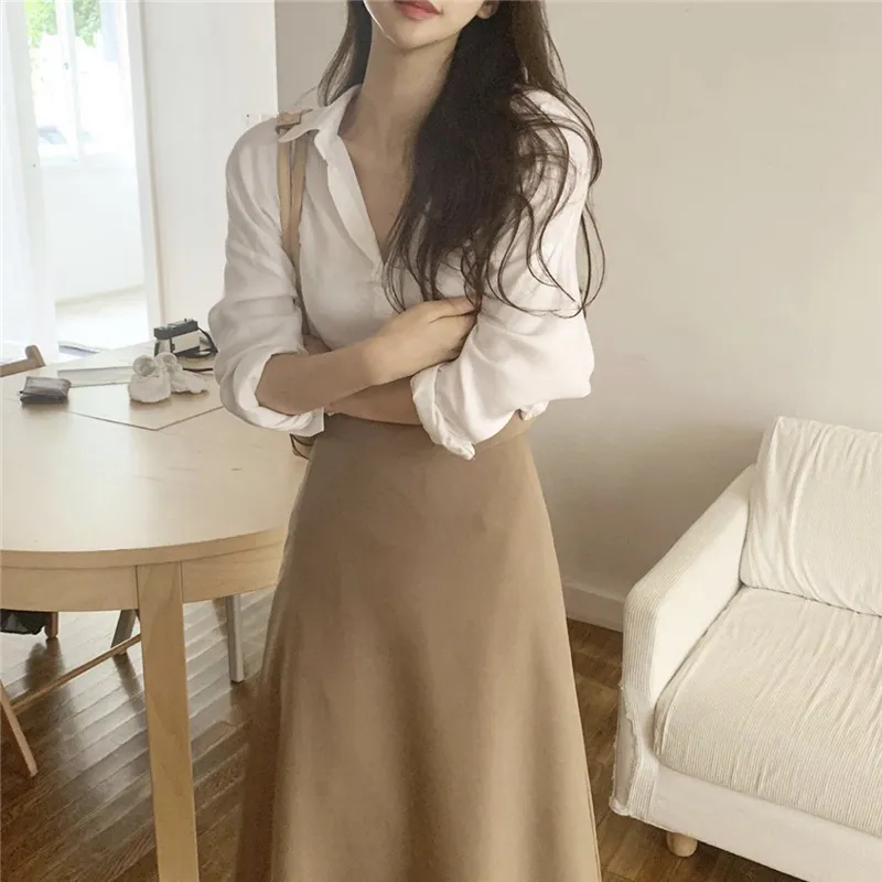Simple Foundation Long Sleeve Shirt High Waist and All Over Body Skirt Suit Women