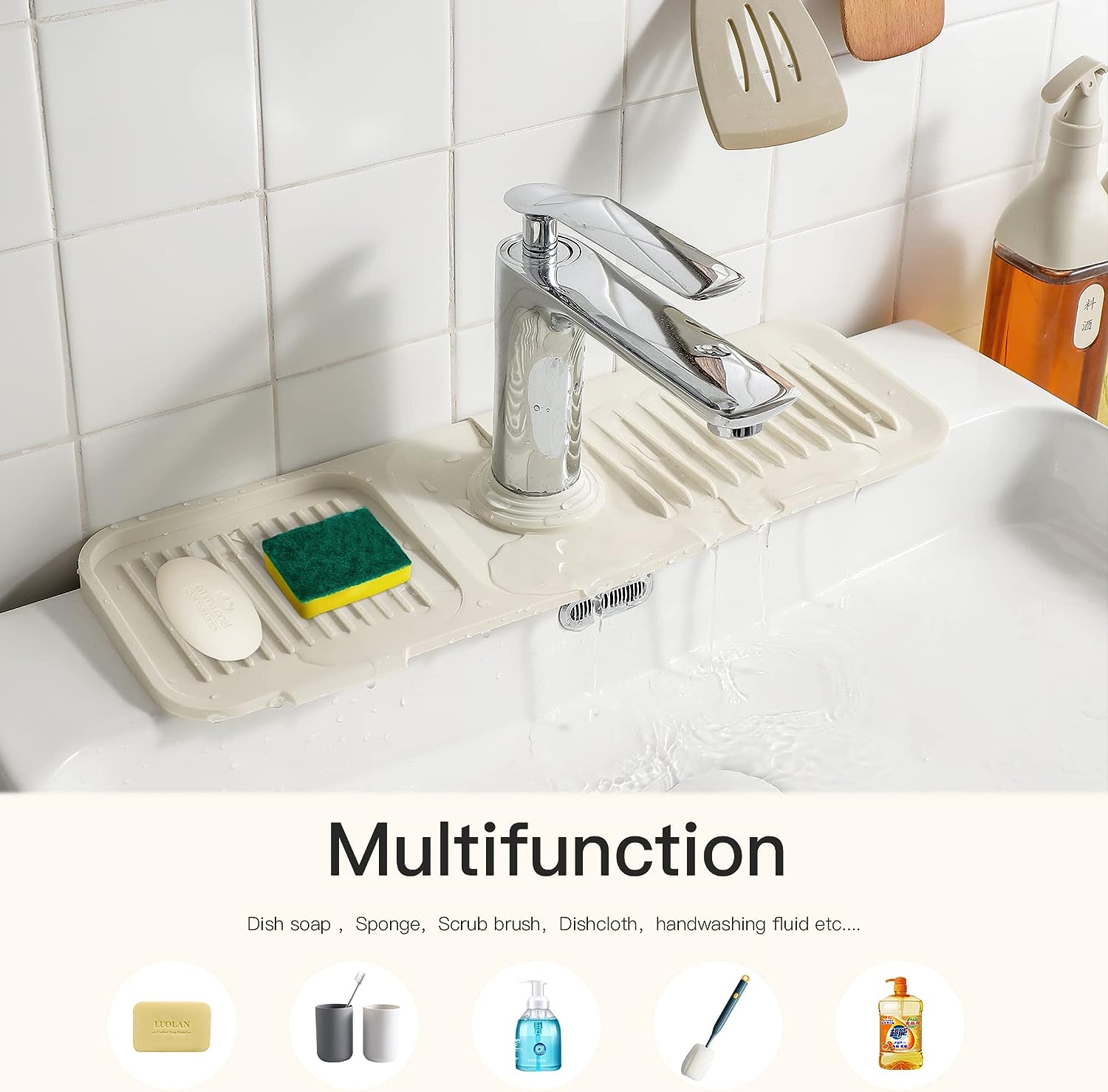WIDE APPLICATION: You can also put a cleaning brush, soap, sponge, and mouthwash cup on this mat,kitchen sink splash