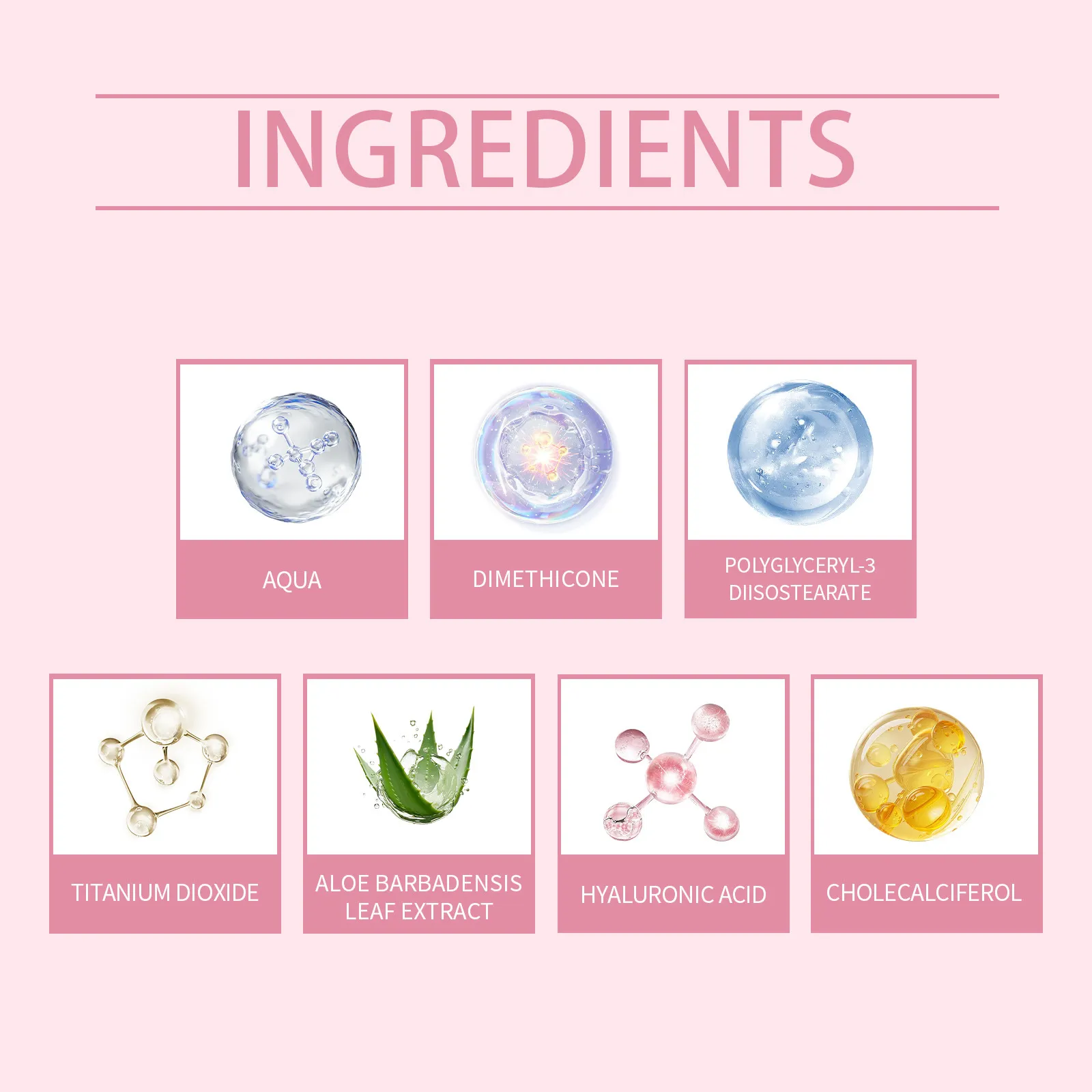 Ingredients: Water, polydimethylsiloxane, polyglycerol-3 diisostearate, titanium dioxide, aloe extract, hyaluronic acid, vitamin D3