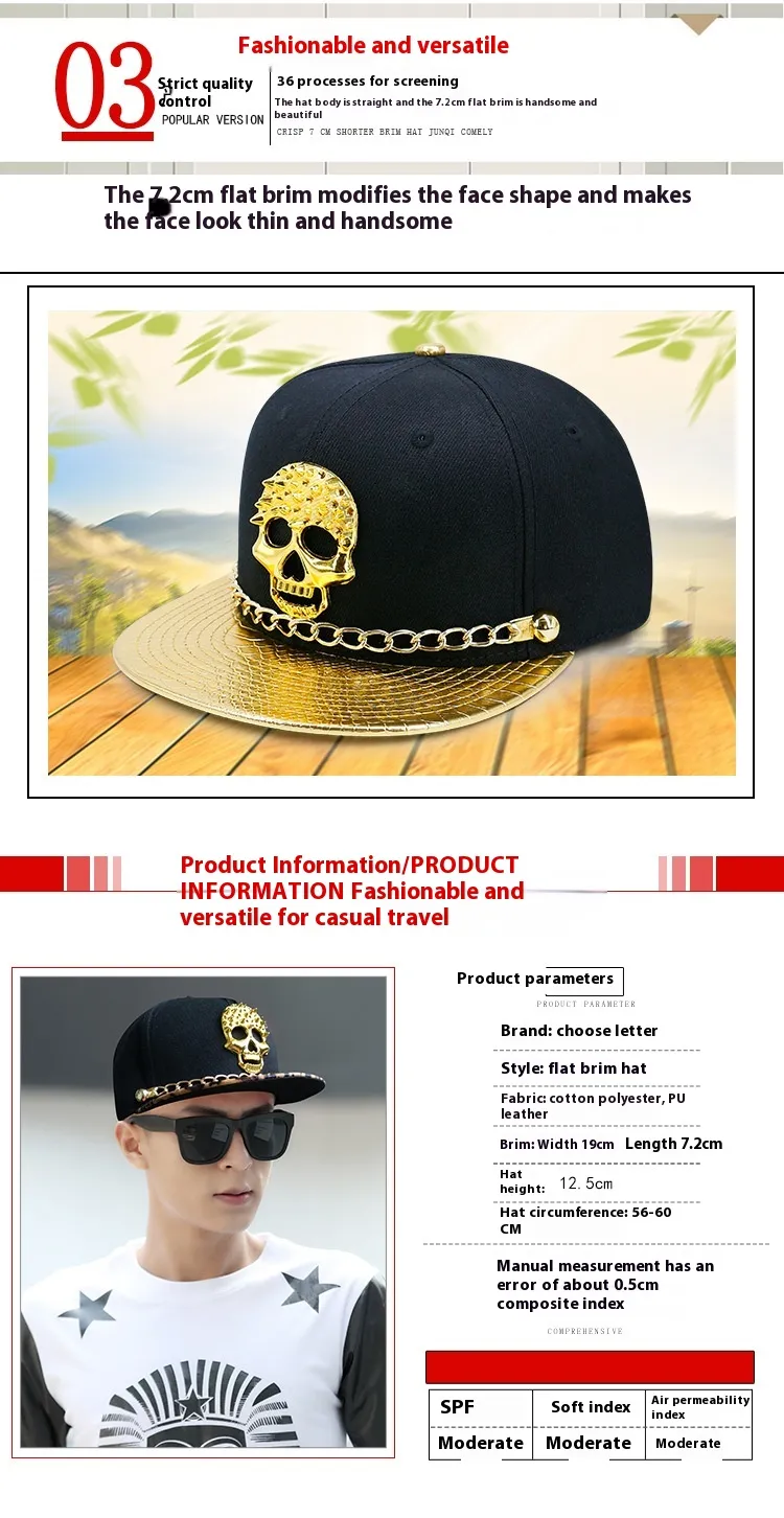The bold design of this cap makes it perfect for events where you want to stand out. Whether you’re at a party, music festival, or simply out with friends, the Skull Rivet Hip-Hop Baseball Cap adds a touch of personality and flair to any outfit. The metal rivets catch the light, making it an eye-catching accessory in any setting, while the flat-brimmed style keeps your look modern and fresh.