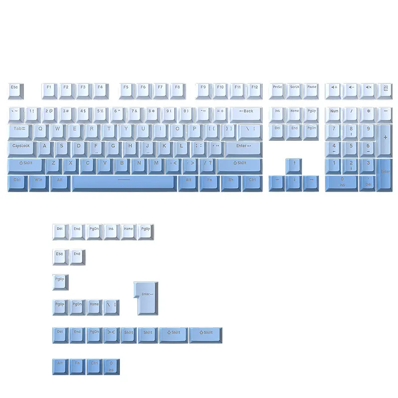 Product Description for Sky Blue Gradient Positive Engraving Luminous 134 Mechanical Key Cap Two-color PBT Injection Molding OEM Height