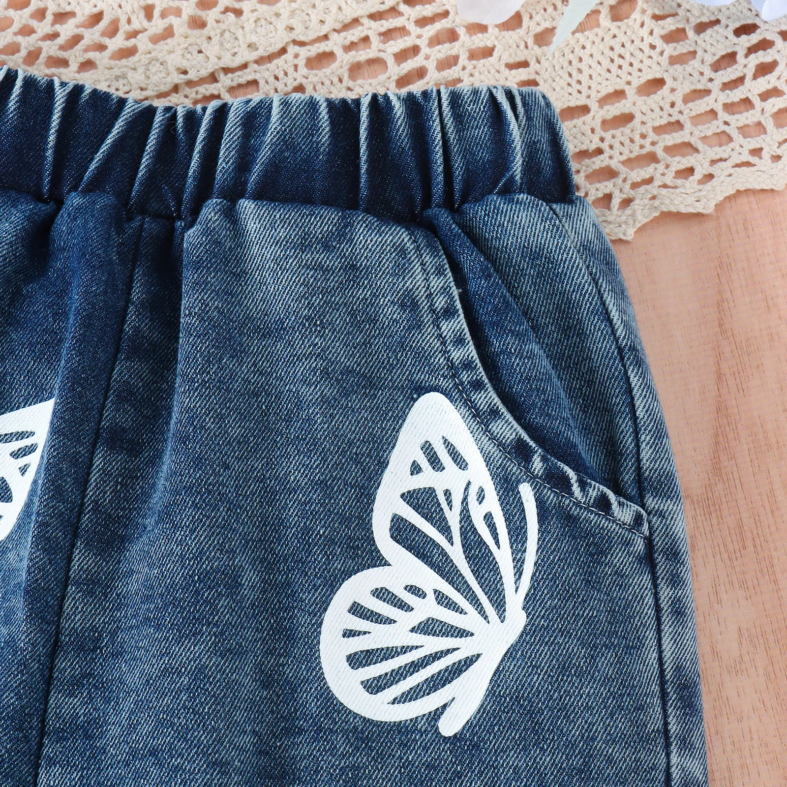 Sleeveless Vest Butterfly Print Washed Jeans Girls Suit