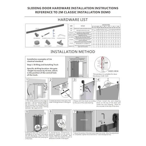 Introduction: The barn door track hardware set is made of high-quality carbon steel, with strong strength and hardness, sufficient to support up to 220 pounds of door panel and confirm the track does not deform. We promise a 5-year free quality assurance to ensure its excellent quality. Q: How to ensure the stability and safety of the door? 2 * Door Stoppers: Two door stoppers slide along the rail and tighten down at any point to stop your door exactly where you want, and they're cushioned by rubber caps for a quiet close. 1 * Floor Guide: A T-shaped floor guide is supplied (with anchors) to prevent the door from swinging out or up against the baseboard. 2 * Anti-jumpers: Those little round discs- go on top of the door and won't allow door to be lifted off rail unless they're turned. Q: How much space do I need above the doorway? A: You will need a minimum of 5" from the top of your door to the ceiling (or crown molding, if any) for this kit to fit correctly. Q: How thick of a door will this kit work with? A: There are solutions for any thickness of door! The bolts included for attaching the hangers to the door support a thickness range of 1 3/8" to 1 3/4", but this can be easily navigated by countersinking the bolt head into the back side of the door, or by picking up 4 longer bolts from your local hardware store. The other thing affected by a thicker door is the spacing needed between the door and wall (or baseboard/doorway trim). Plug in your door depth and trim depth below: