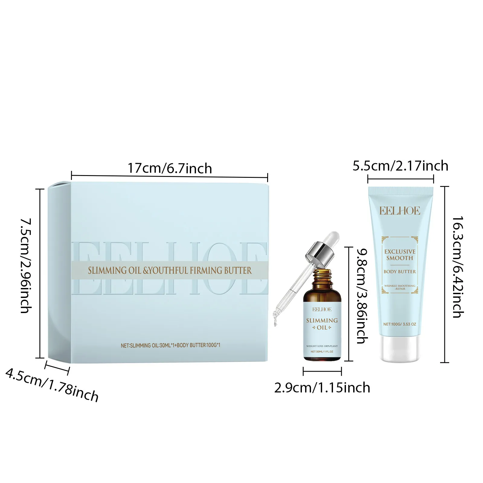 Product Size: essence oil 2.9 x2.9x9.8cm; Tightening cream 5.5 x3.8x1 6.3cm.