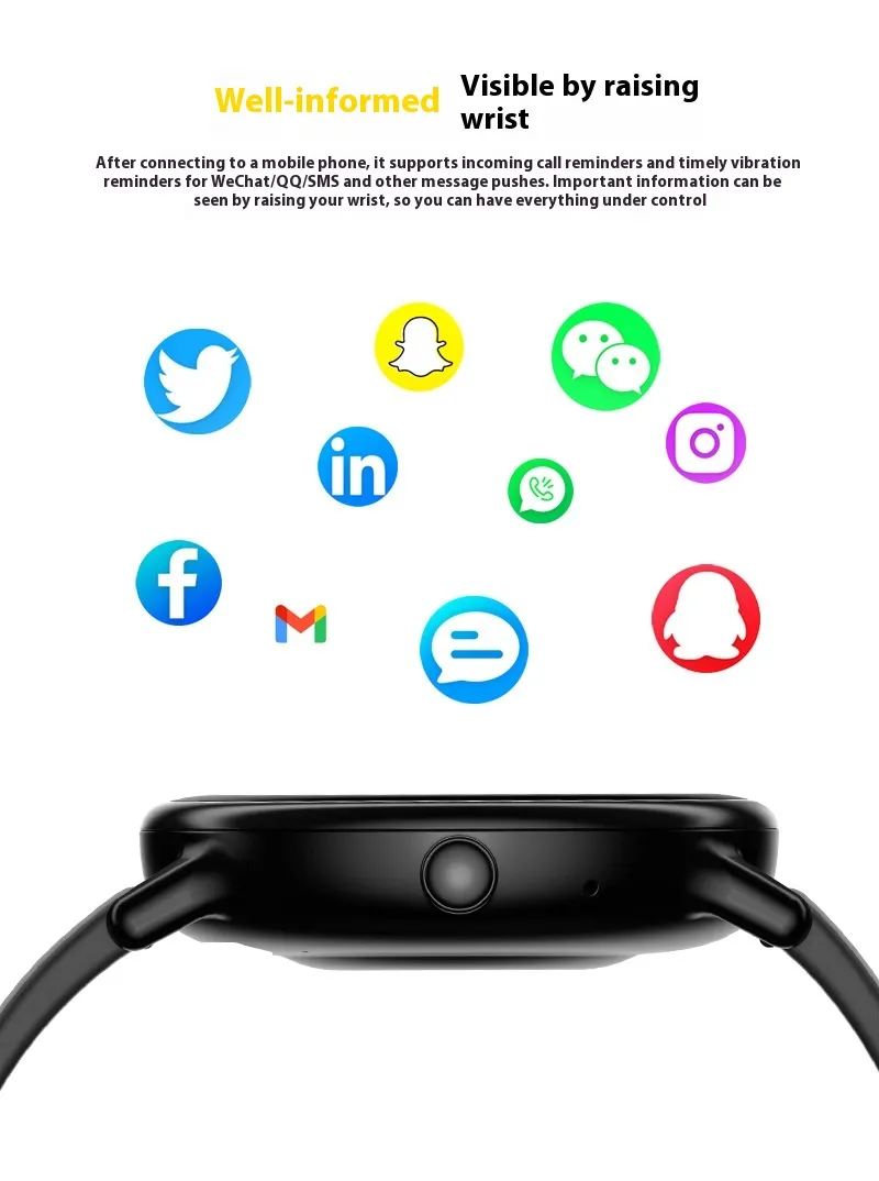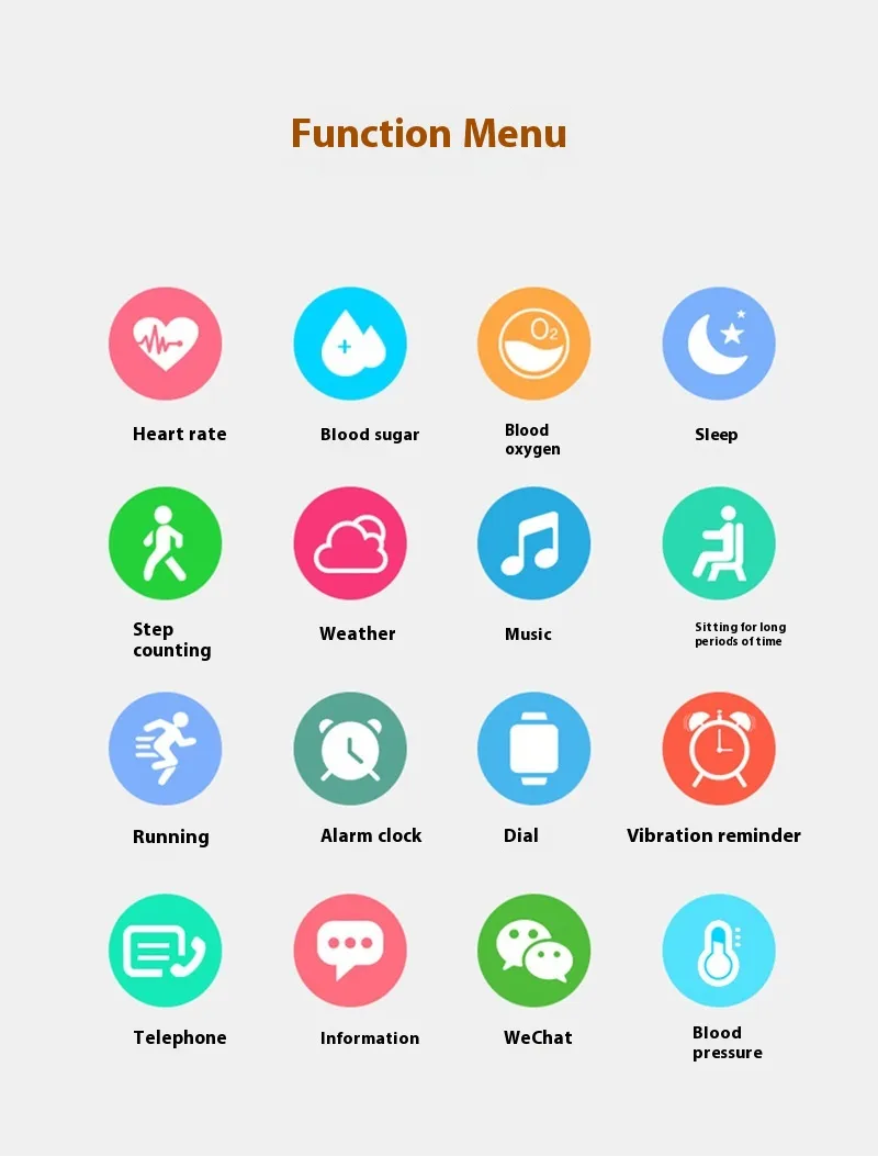 Functions: Waterproof, photo taking, step counting, heart rate monitoring, blood pressure measurement, social entertainment, Bluetooth call,