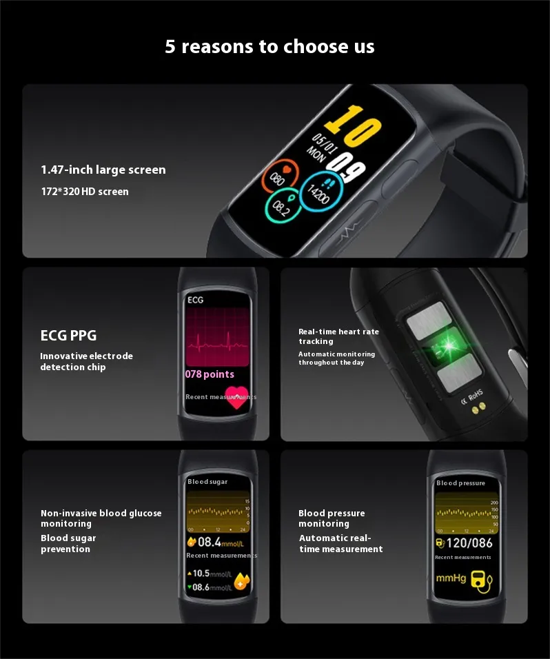 Stay on top of your health with the revolutionary Smart Bracelet with Non-Invasive Blood Glucose, Heart Rate, Blood Oxygen, and ECG Monitoring. This cutting-edge wearable combines advanced health technology with sleek design, offering real-time insights into your vital signs. Whether you’re managing a medical condition, optimizing fitness, or simply maintaining a healthy lifestyle, this smart bracelet is your trusted companion for complete health tracking.