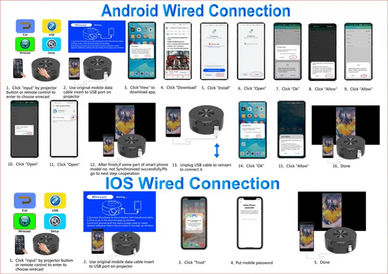 3. Adjust Projection Size: Adjust the imaging distance to adjust the projection size from 14 inches to 100 inches. Wire screen projection, use the smartphone data cable to connect the projector to realize the screen projection function, and support both for iOS and for Androids systems.