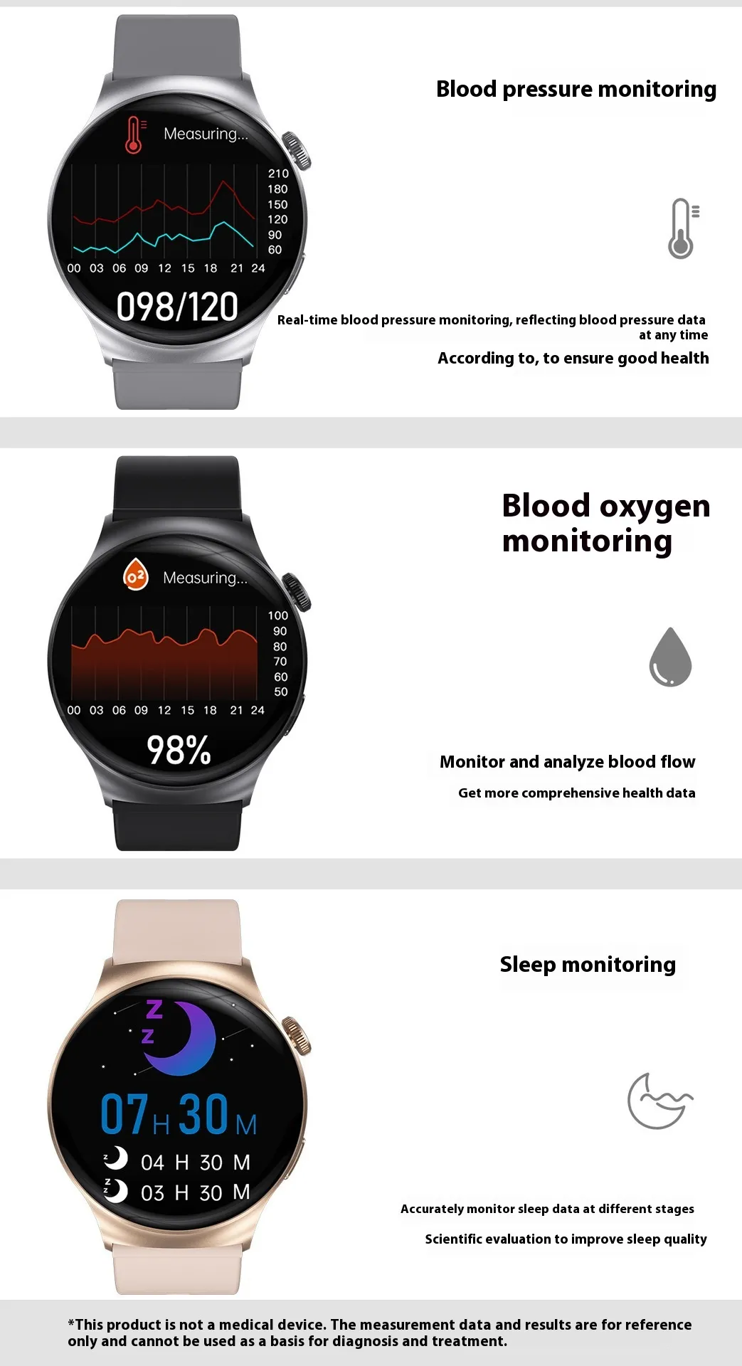 Functions: Waterproof, photographing, step counting, heart rate monitoring, blood pressure measurement, Bluetooth calling, smart reminder,